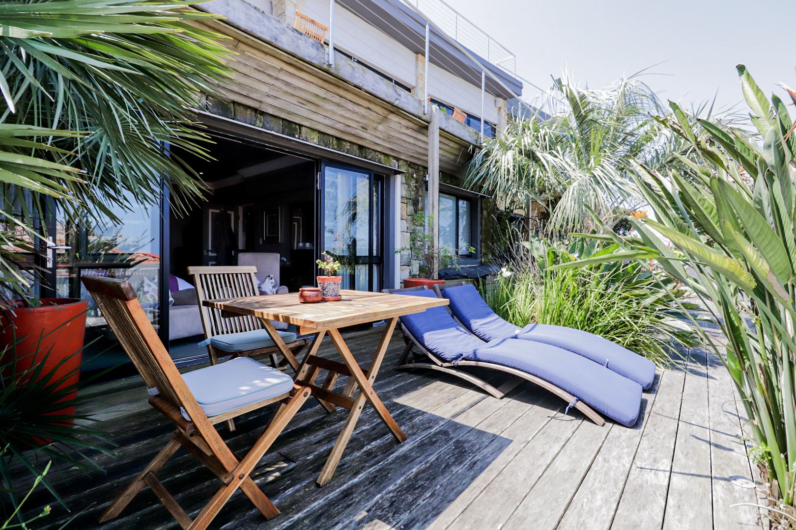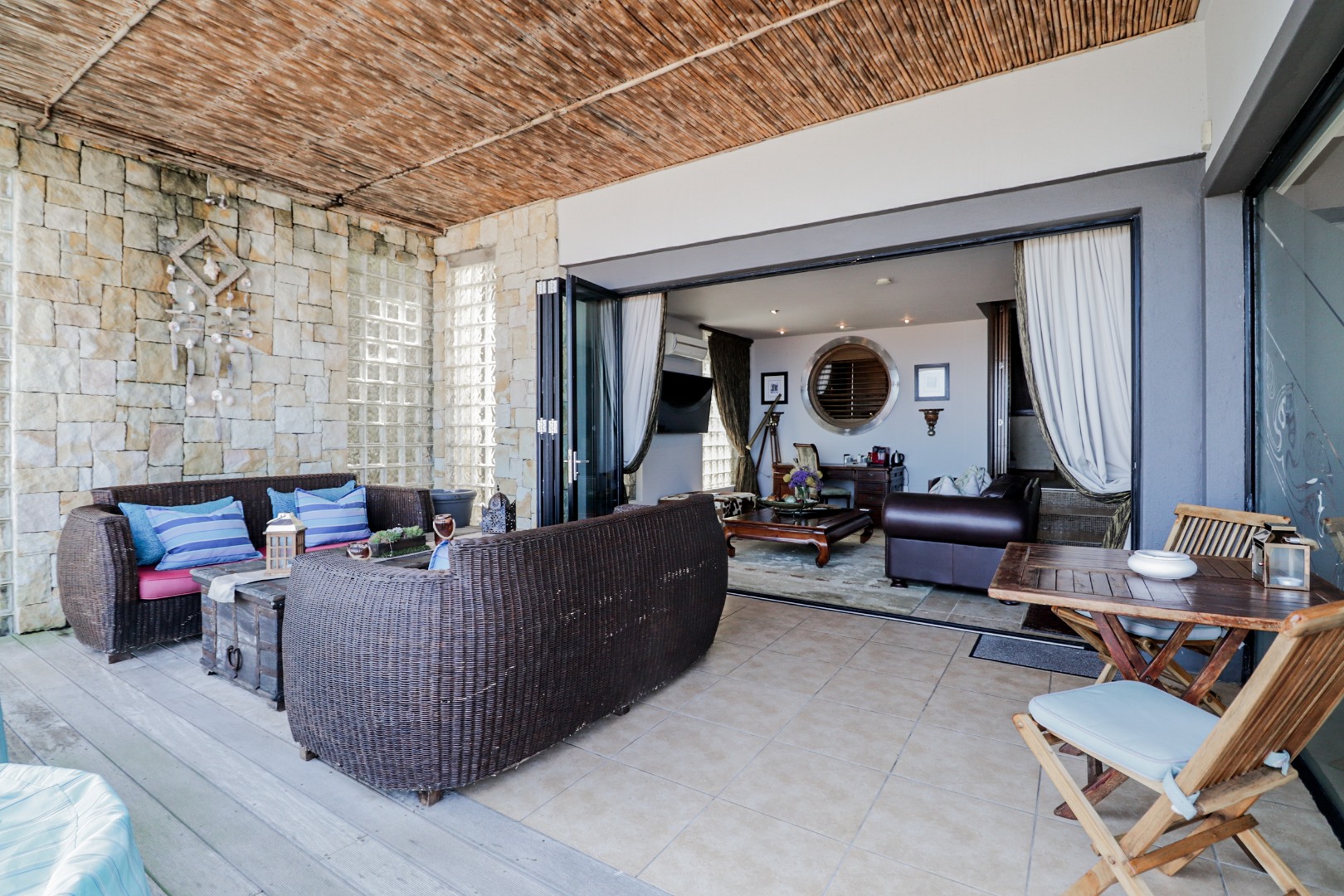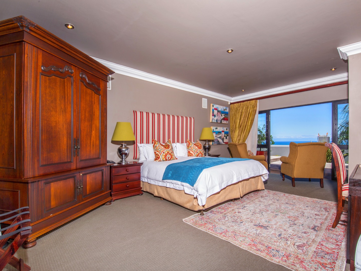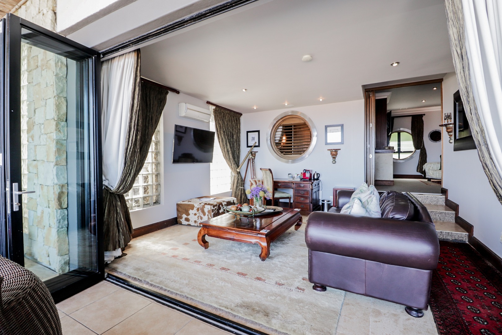 The top level flows outwards towards a covered patio with rim-flow pool, jacuzzi and sunny wooden deck. Ideal for sundowners after a day of sight-seeing. There are a fully equipped kitchen, laundry and storeroom.