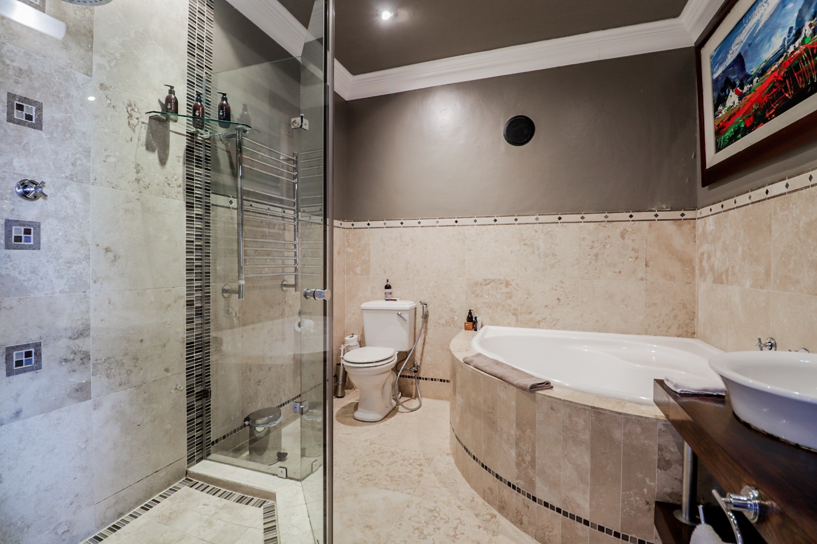 Lower Level: Bedroom 5 - Bedroom on-suite bathroom {double basin, shower, corner bath & toilet} private outside patio & ocean view