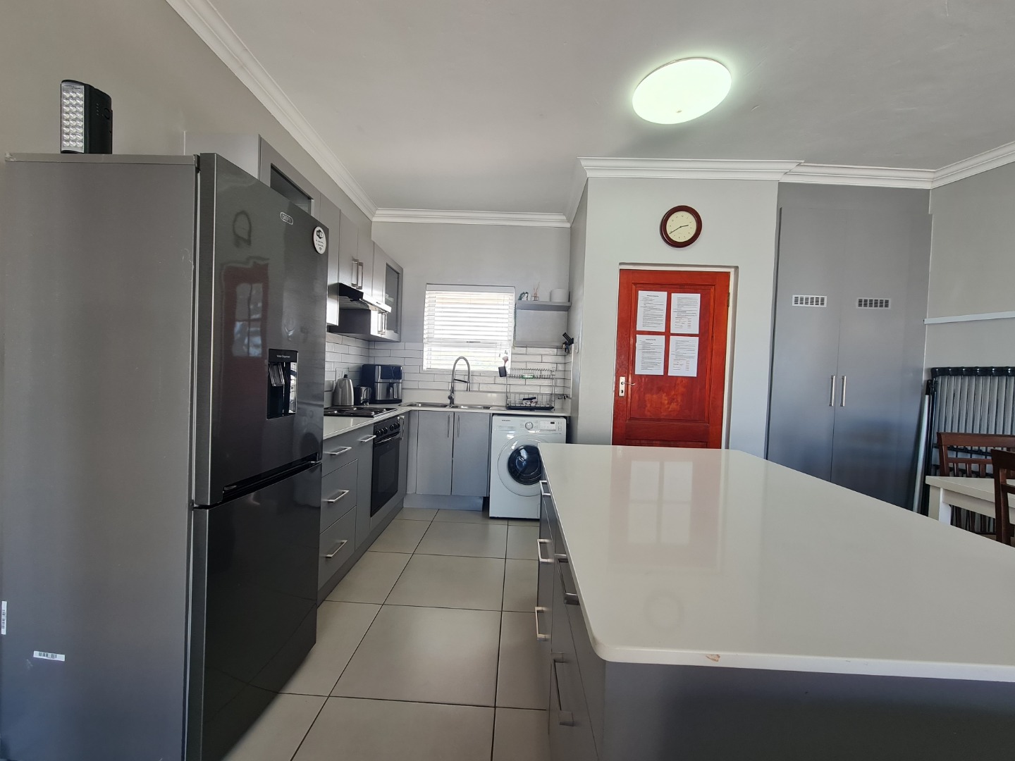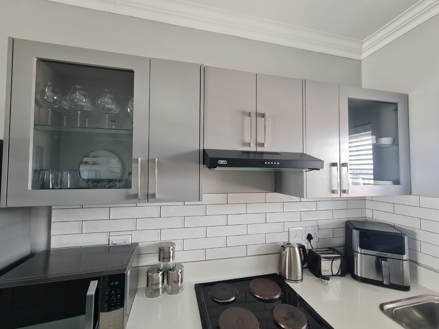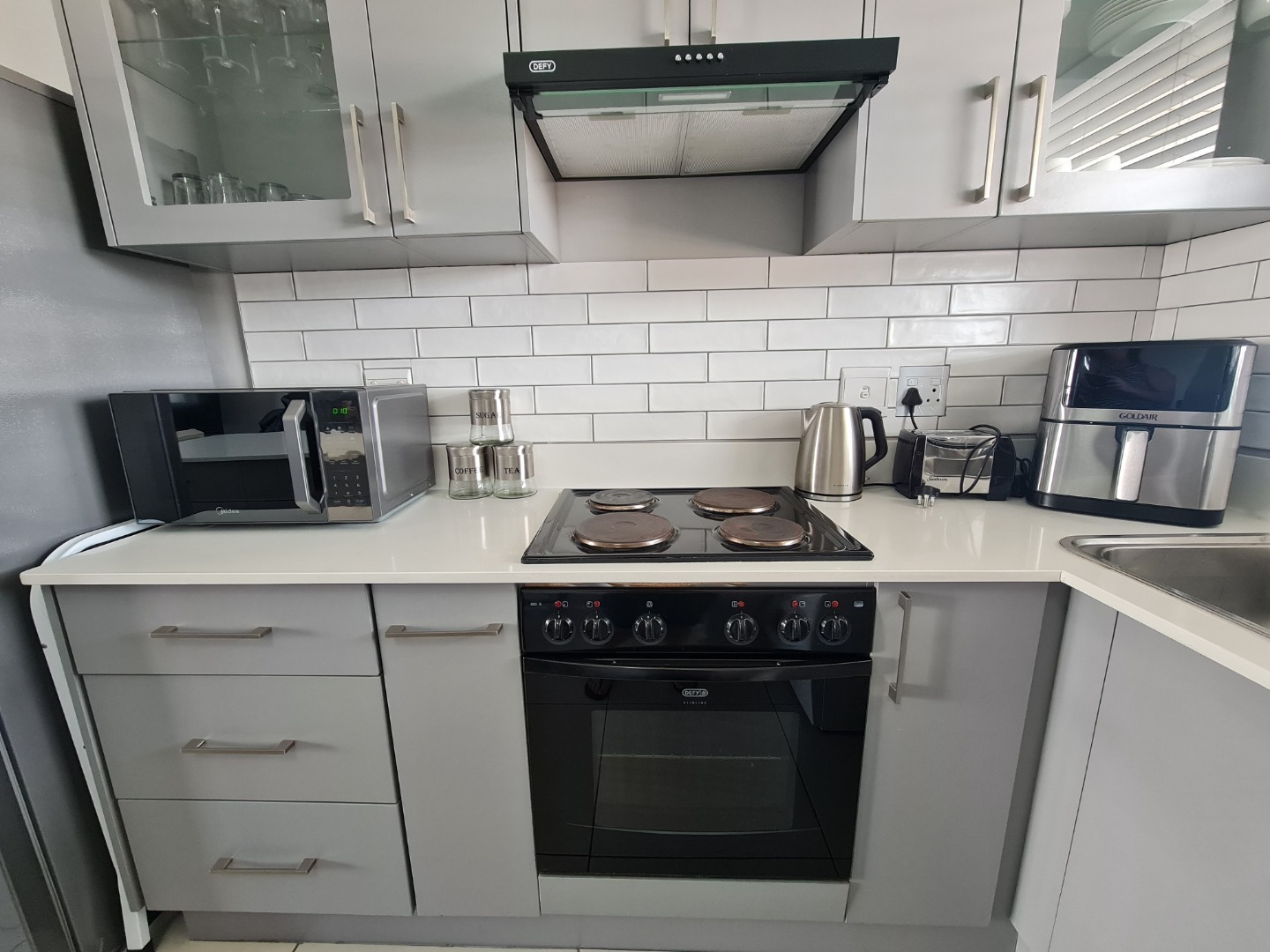Step inside to an open-plan living area, seamlessly integrating the lounge, dining, and kitchen spaces. The interior features durable tiled flooring throughout, complemented by a modern, neutral aesthetic. The functional kitchen is well-equipped with visible appliances, including an integrated washing machine, making daily chores effortless. The property is offered fully furnished, providing immediate comfort and a cohesive nautical-themed decor.