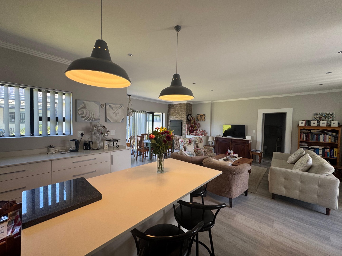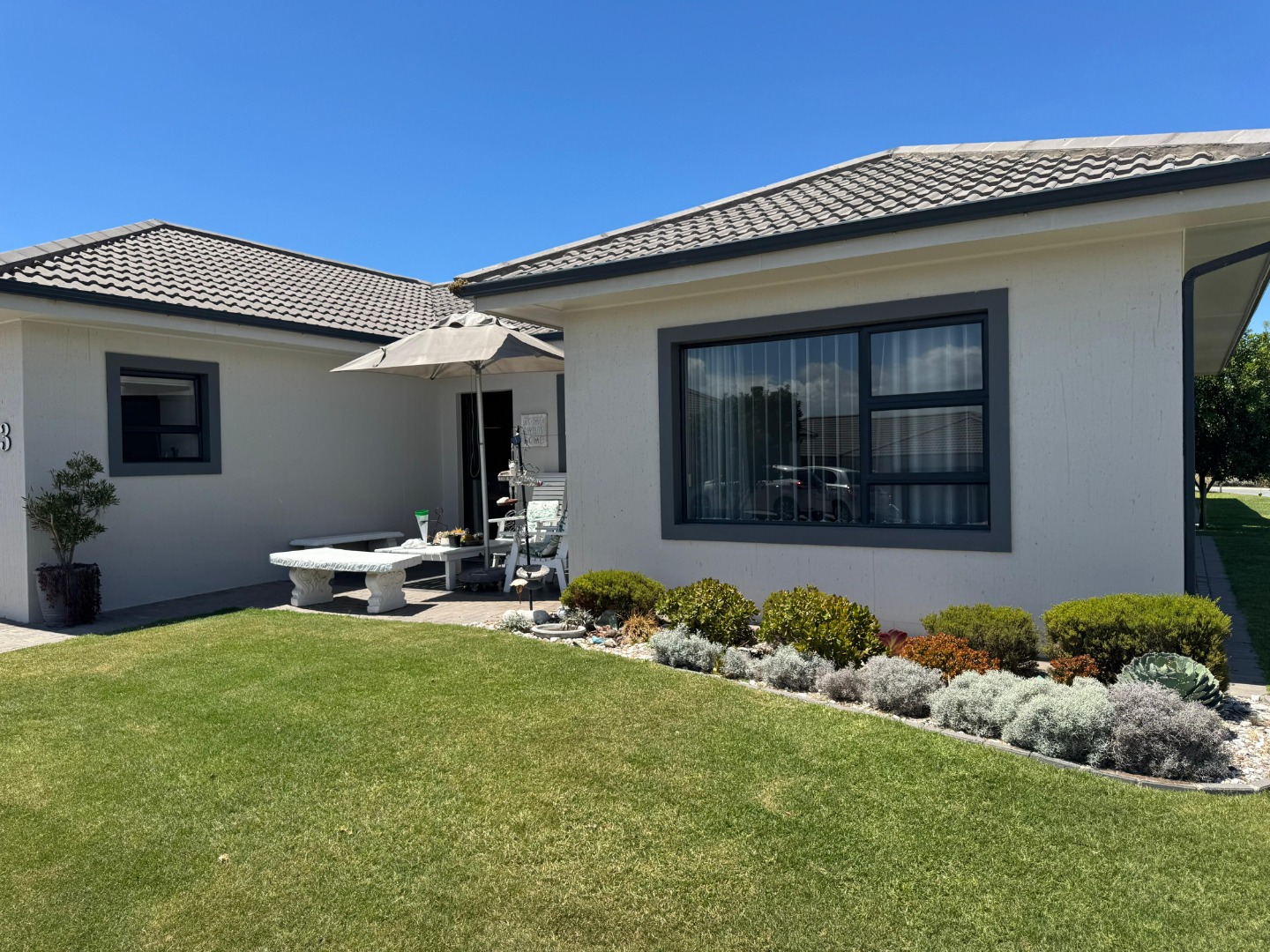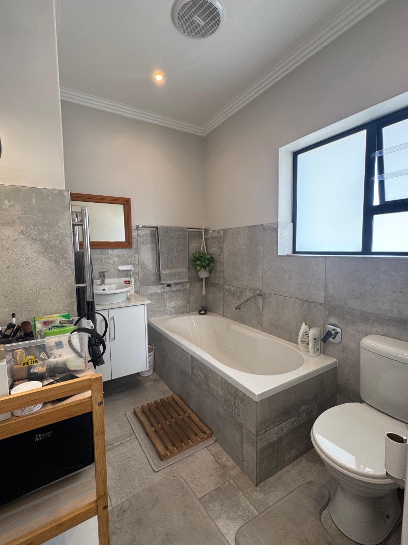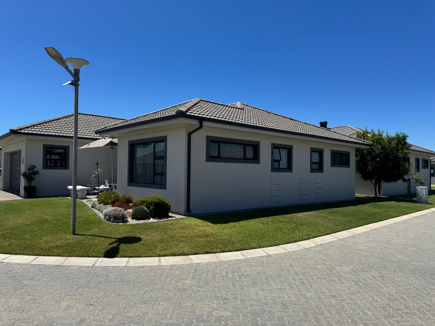 Discover modern coastal living in this charming single-story home, perfectly situated within a sought-after retirement village in Diaz Beach, Mossel Bay. The property boasts excellent kerb appeal with its contemporary light-colored facade, dark tiled roof, and neatly manicured lawn. A paved driveway leads to a double garage, complementing the inviting front patio, ideal for enjoying the serene surroundings. Step inside to an expansive open-plan living and dining area, designed for comfort and seamless entertaining. The interior is bathed in natural light, enhanced by modern light-toned flooring and recessed lighting. The contemporary kitchen forms the heart of the home, featuring crisp white cabinetry, a practical island/breakfast bar, and ample counter space with a double stainless steel sink. A distinctive stone-clad feature wall adds character, while crown molding provides a refined finish. This residence offers two comfortable bedrooms, each designed as an ensuite for ultimate privacy and convenience, totaling three well-appointed bathrooms. A dedicated utility room further enhances practicality and daily living flow. The manageable 314 sqm erf includes a well-maintained garden and paved areas, perfect for low-maintenance outdoor enjoyment, complete with a built-in braai. Residents benefit from a secure environment within the retirement village, featuring 24-hour security, an access gate, electric fencing, and burglar bars. Fibre-ready and equipped with water tanks, this home promotes modern convenience and sustainability. Nestled in picturesque Diaz Beach, this property offers an idyllic coastal lifestyle. Key Features: * 2 Bedrooms, 3 Bathrooms (2 Ensuites) * Spacious Open-Plan Living * Modern Kitchen with Island * Double Garage * Built-in Braai * Fibre Ready & Water Tanks * 24-Hour Security & Access Gate * Coastal Retirement Village Living