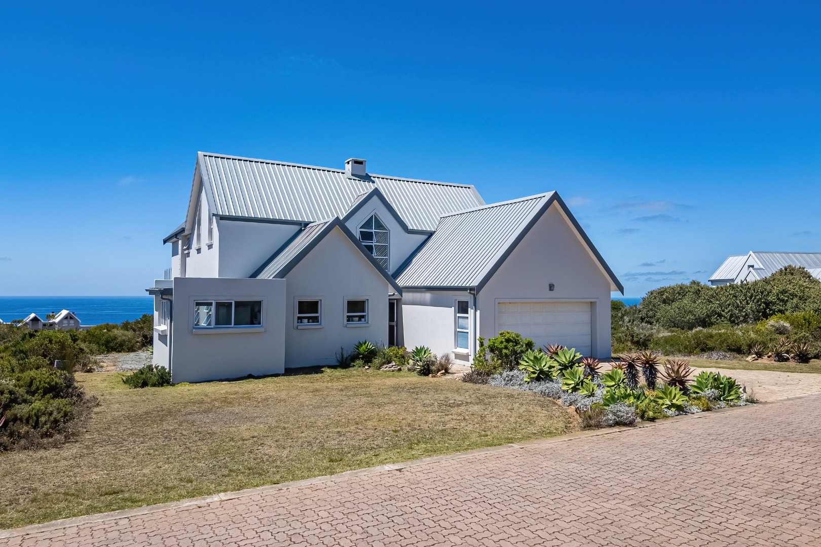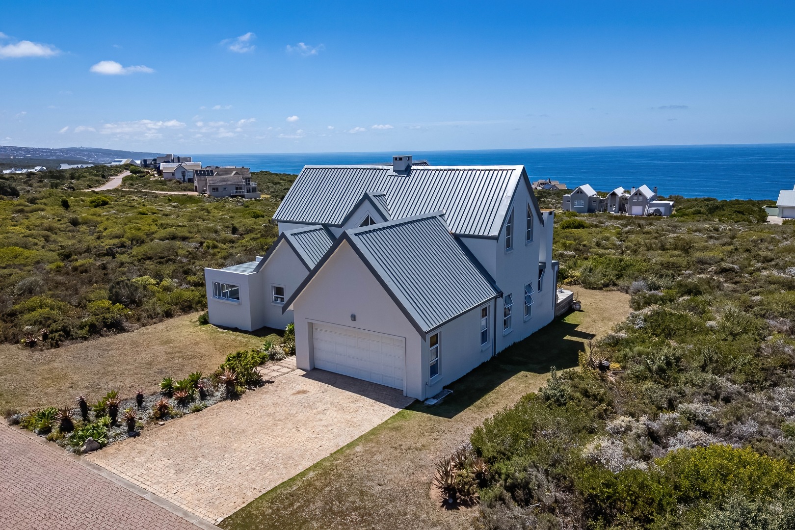 Perched majestically above the azure expanse, this architectural masterpiece in Nautilus Bay Coastal resort, on the outskirts of Mossel Bay, presents an unparalleled coastal living experience. The residence, with its modern, multi-gabled design and pristine light exterior, immediately captivates, promising a lifestyle of serene luxury. A substantial paved driveway leads to a double garage, offering ample space for vehicles. At the same time, the home itself is gracefully nestled amidst indigenous fynbos vegetation, ensuring both privacy and a harmonious connection with nature. The exterior boasts clean lines and a well-maintained aesthetic, hinting at the meticulous care within.