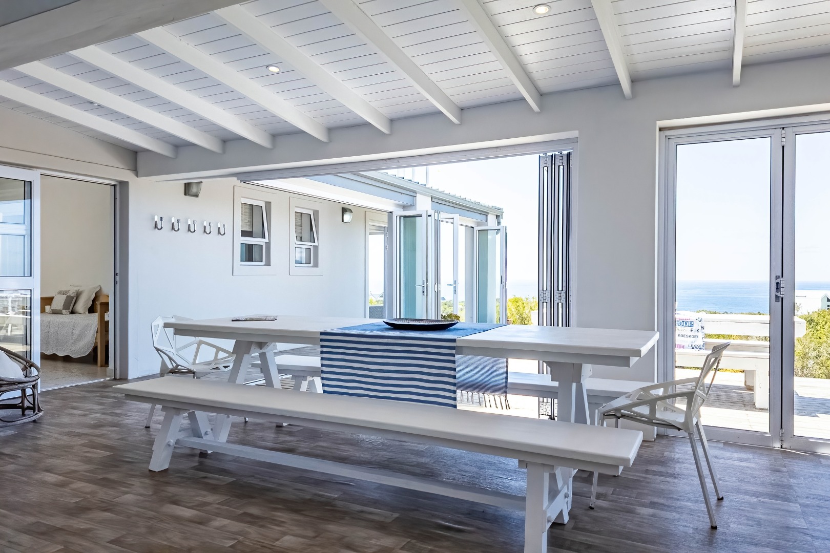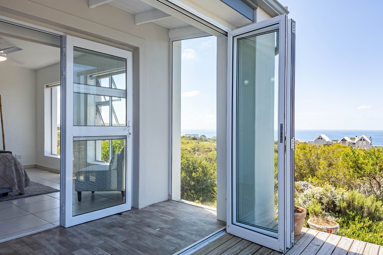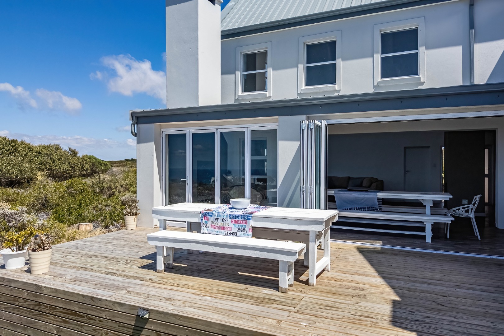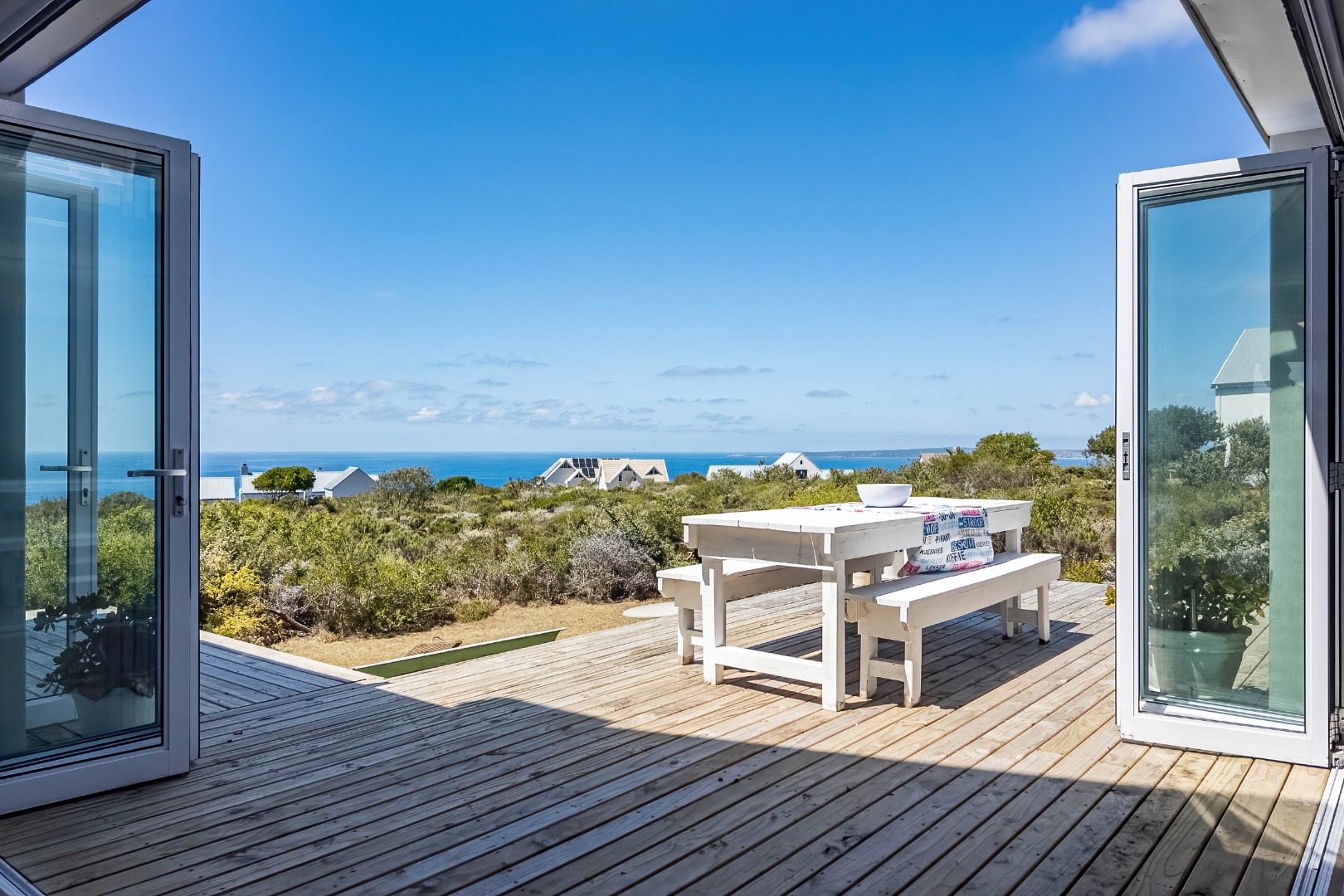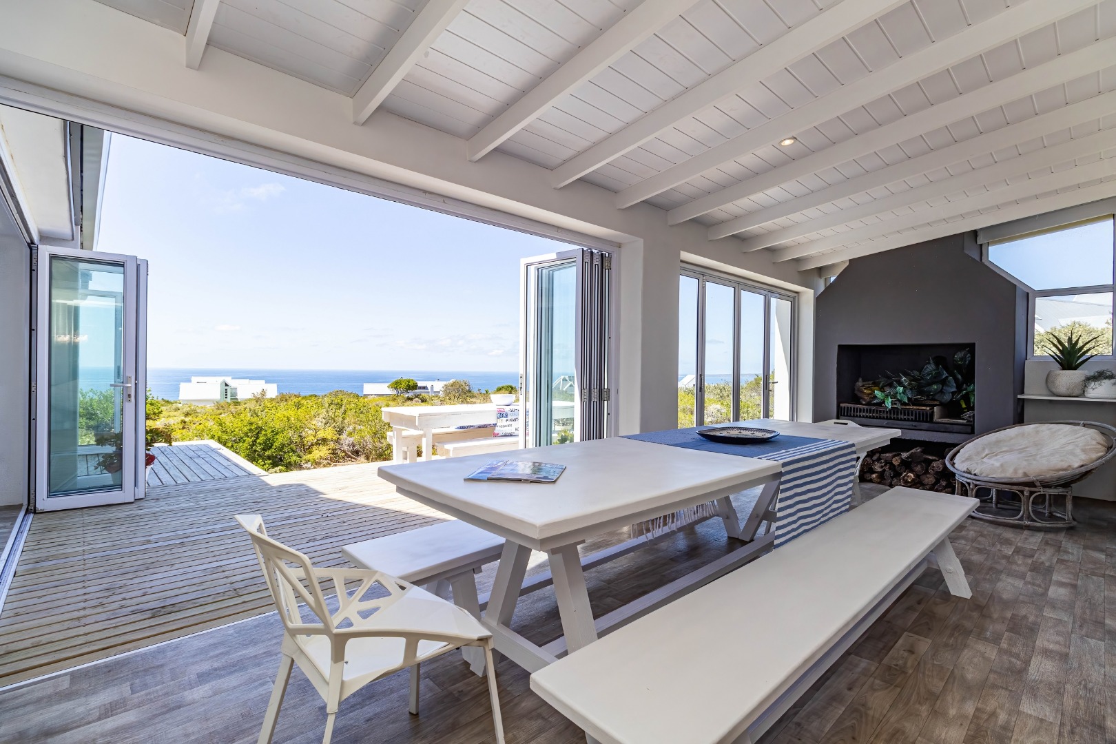 The true essence of coastal living is celebrated outdoors, where an expansive wooden deck beckons. This magnificent outdoor haven, accessible via large bi-fold doors, offers panoramic, uninterrupted ocean views that stretch to the horizon, creating an idyllic setting for al fresco dining, entertaining, or simply unwinding amidst the gentle sea breeze. The natural, low-maintenance coastal landscaping, featuring fynbos, blends seamlessly with the surroundings, enhancing the property's secluded charm. With a double garage, convenience is paramount, ensuring secure parking and additional storage.