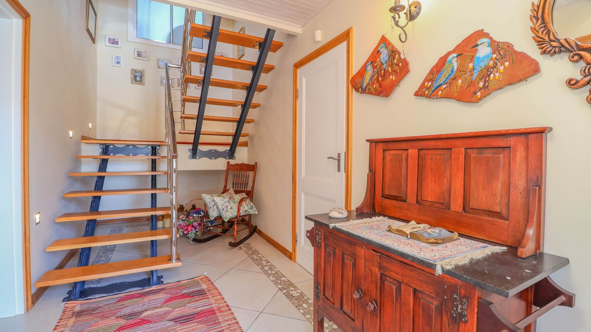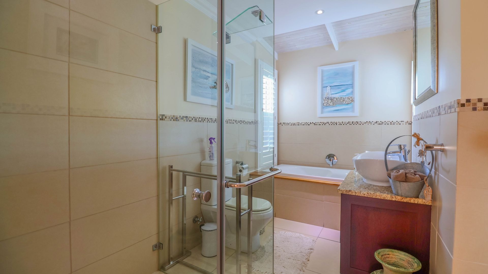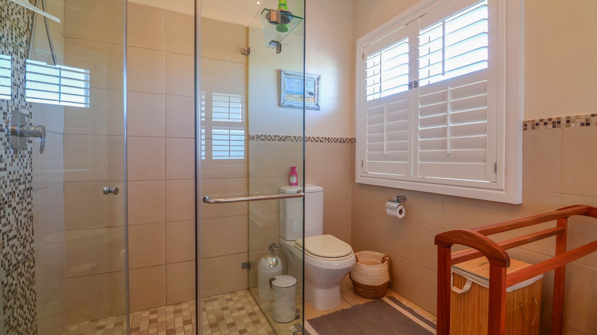 Ascending to the top level via the staircase, you enter a private sanctuary comprising of the main bedroom suite. This space features a carpeted bedroom with built-in cupboards, double-volume ceilings, and a luxurious full en-suite bathroom fitted with under floor heating, his and hers vanities, and a fixed heater. A warm and inviting study with wooden finishes and under floor heating adds a functional workspace to the upper floor. Completing this peaceful retreat is a private balcony where you can enjoy your morning coffee while watching the waves break along the shore. The house is fitted with 24 solar panels a 10KVA Inverter and 3x5,5KVA batteries as a backup supply to Eskom.