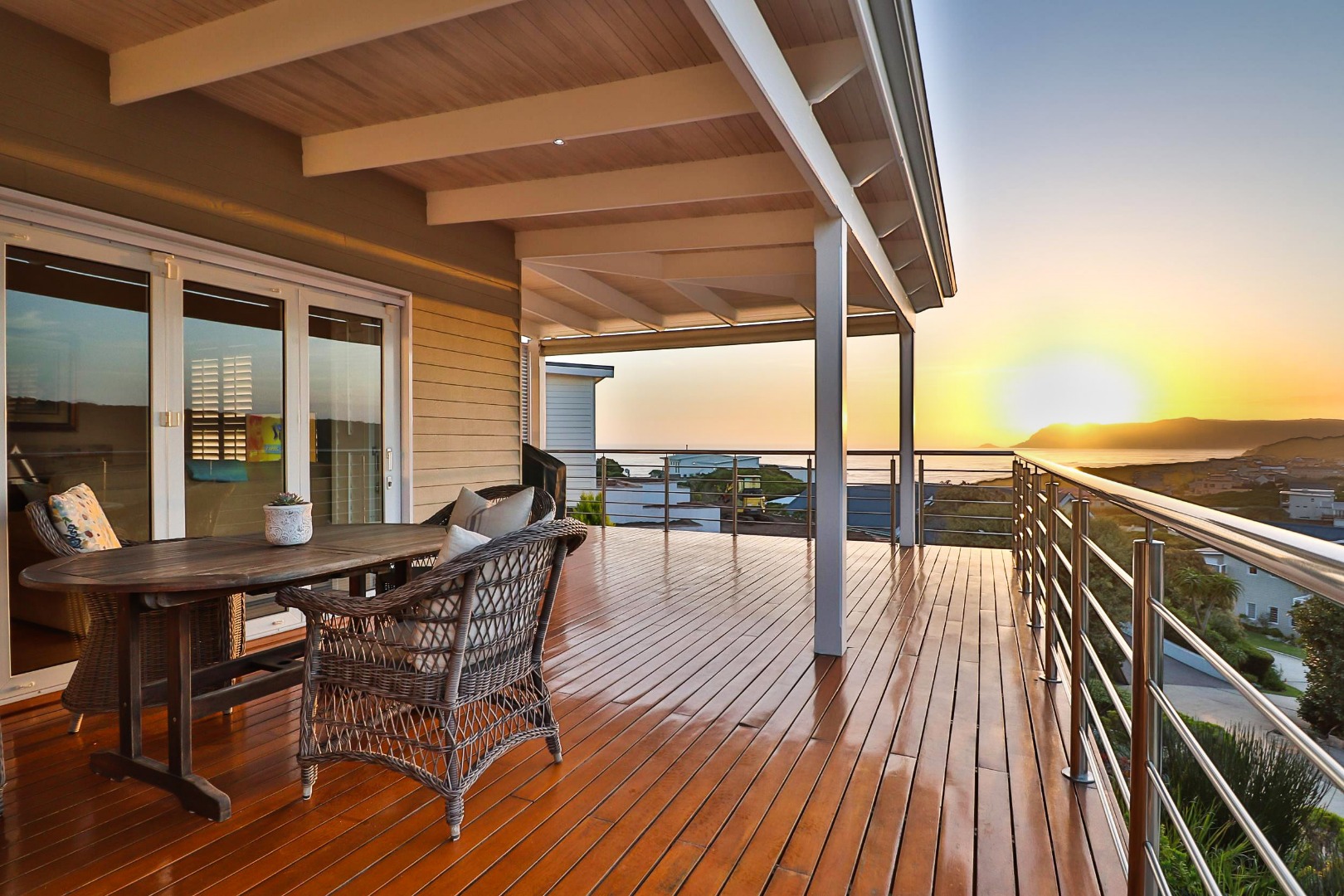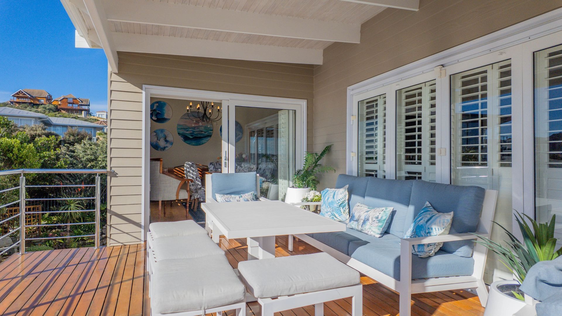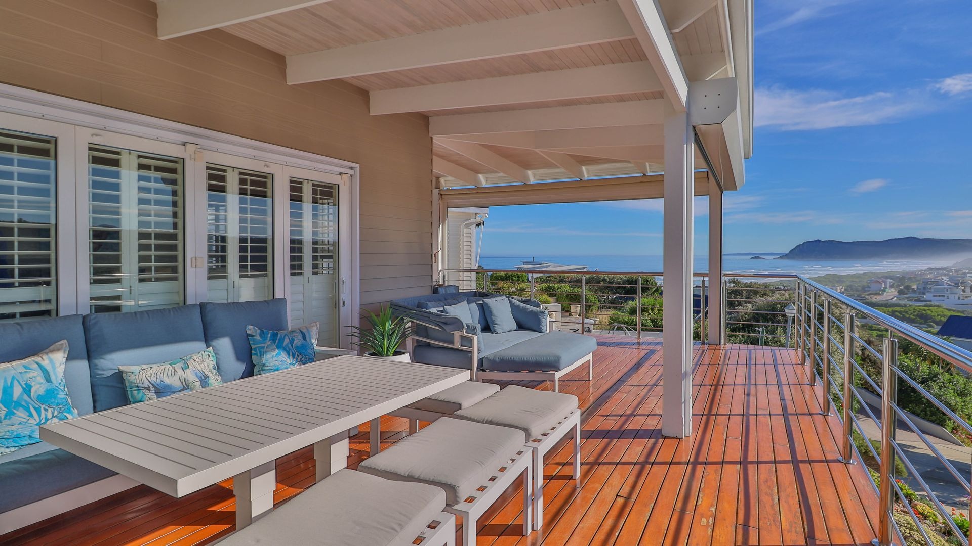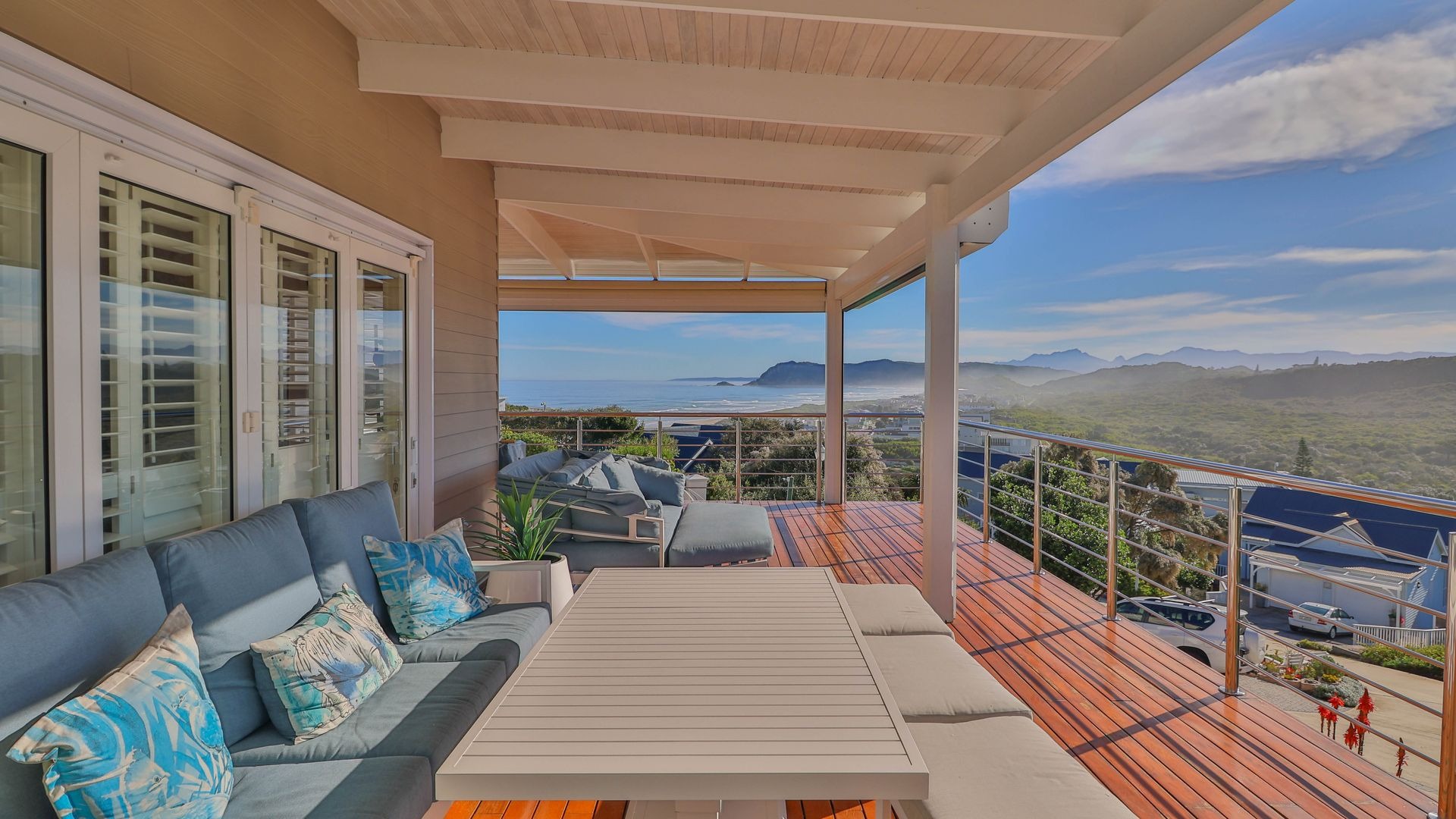 The open-plan living and dining areas are ideal for entertaining or relaxed evenings, with seamless indoor-outdoor flow through French stacker doors onto a large deck made of Brazilian hardwood. The elevated deck offers uninterrupted views over Gericke's Point and the Outeniqua Mountains, making it the perfect backdrop for sunset gatherings.