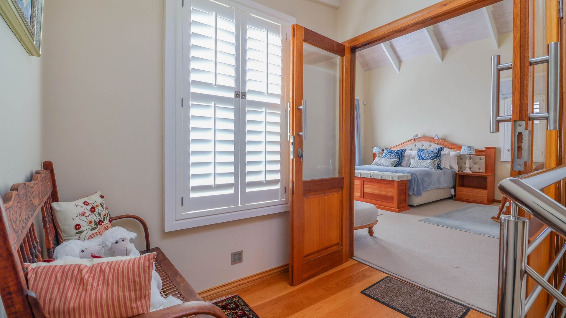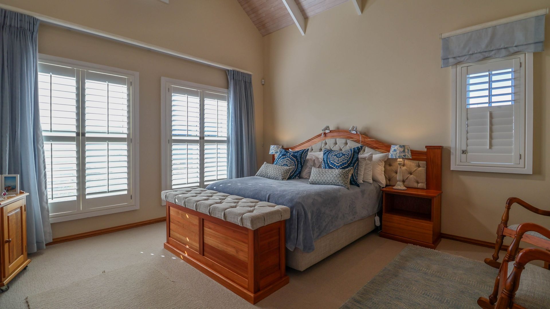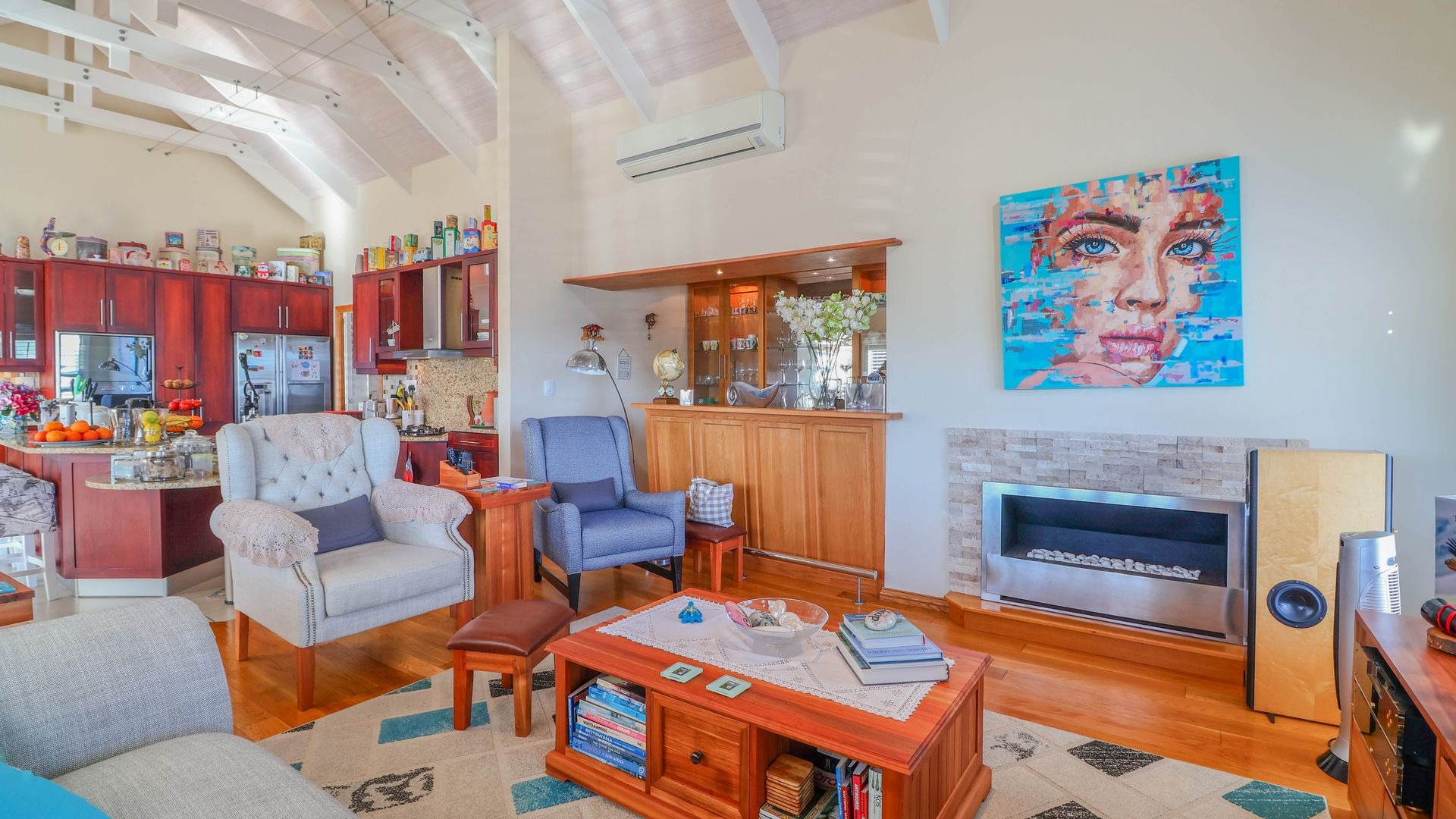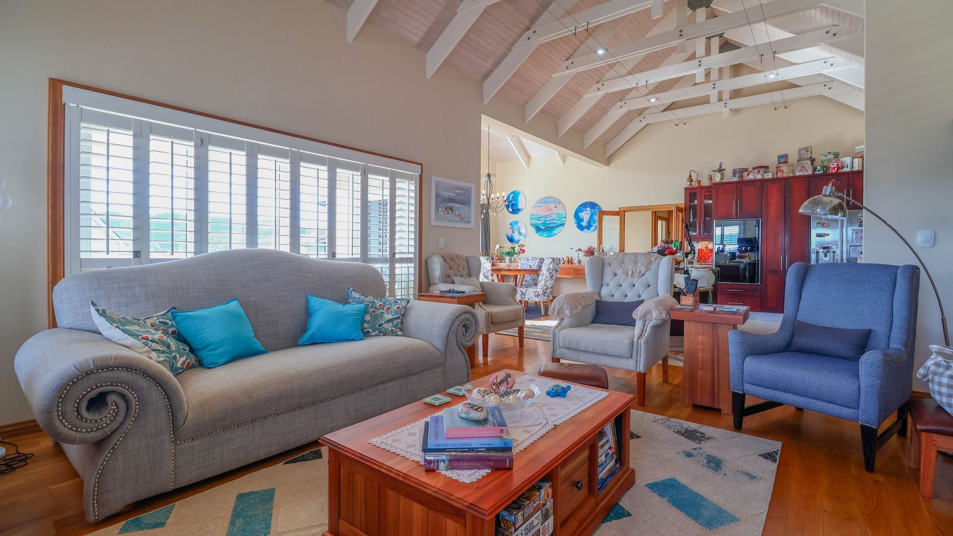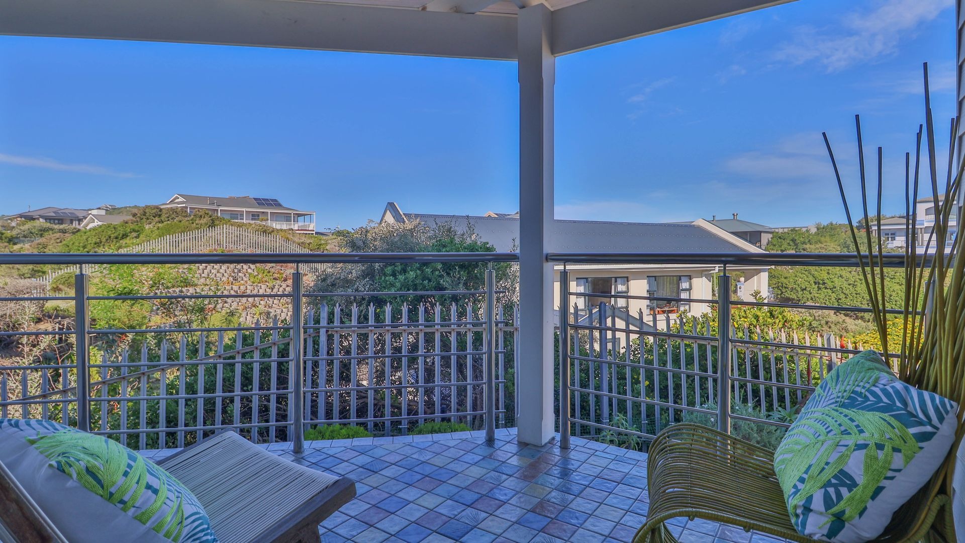 The open-plan living and dining areas are ideal for entertaining or relaxed evenings, with seamless indoor-outdoor flow through French stacker doors onto a large deck made of Brazilian hardwood. The elevated deck offers uninterrupted views over Gericke's Point and the Outeniqua Mountains, making it the perfect backdrop for sunset gatherings.