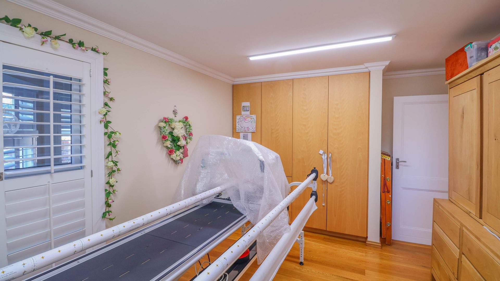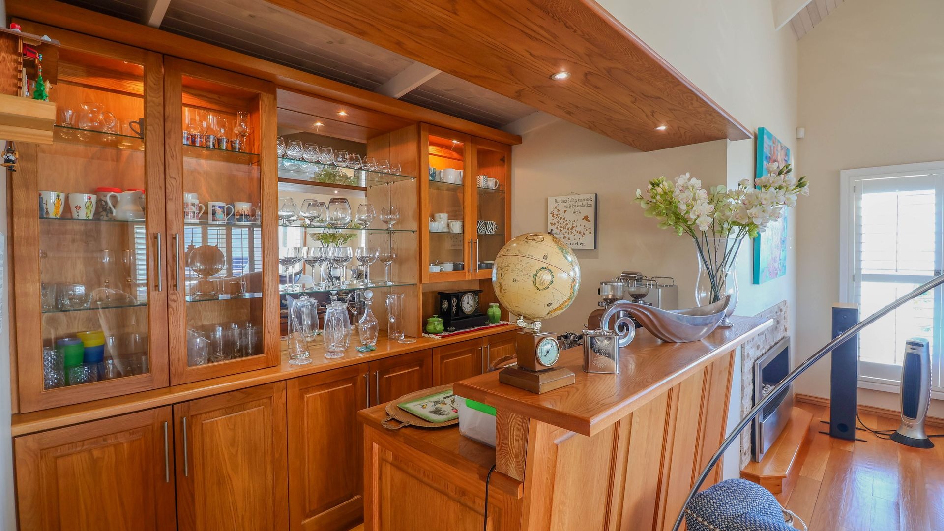 The living space also includes a gas fireplace for winter warmth, American shutters for privacy and light control, and a beautifully crafted English Oak built-in bar for sophisticated hosting. The kitchen, finished in rich Mahogany, is equipped with a gas hob and electric oven, complemented by a separate scullery for added convenience. An additional room adjacent to the kitchen provides a flexible space that can be used as a games room, sewing room, or converted into a fourth bedroom, depending on your needs.