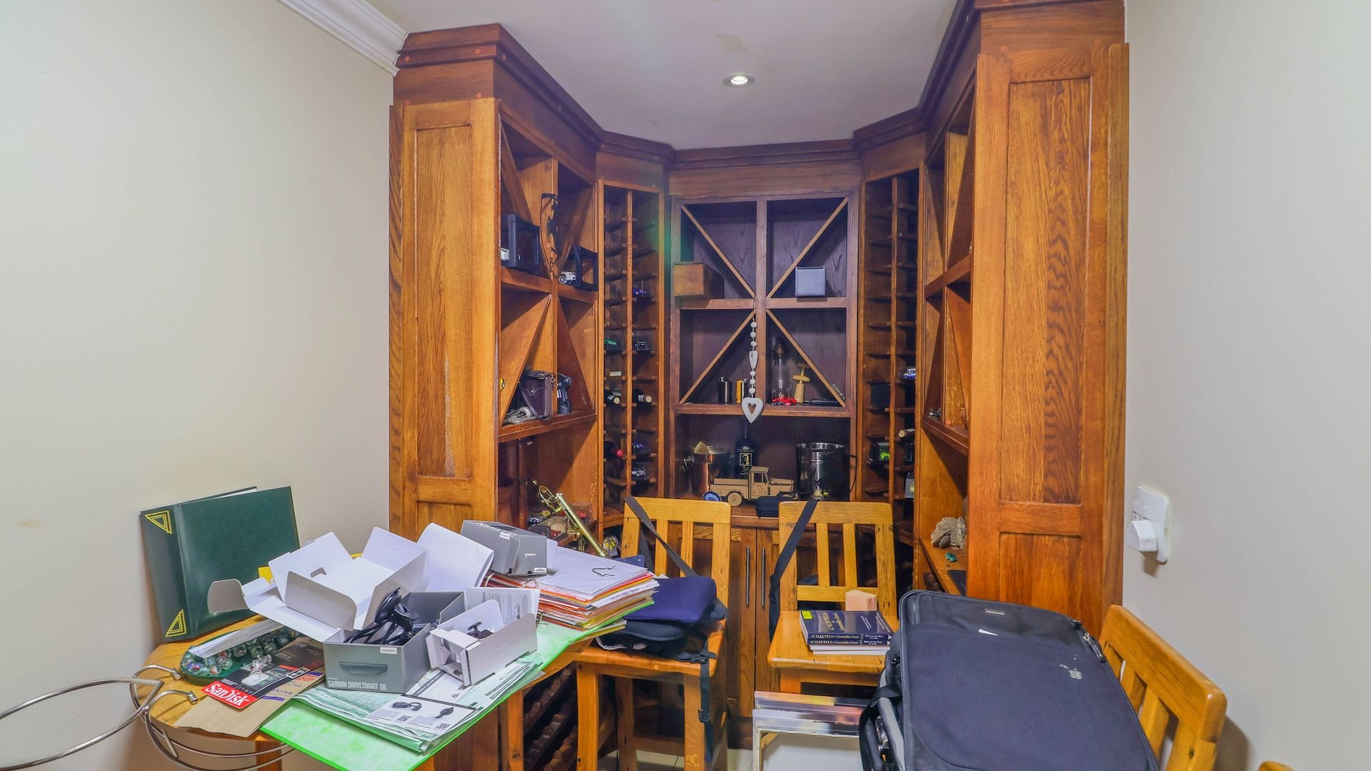 On the ground level, the property offers three garages, along with a spacious workshop or hobbies room. Upon entering the home, you are welcomed by a beautifully crafted wine cellar featuring wood finishes, as well as a convenient guest toilet. A staircase made of American Oak leads to the first level, where the double-volume ceilings create an airy, light-filled space. This level features two spacious guest bedrooms with built-in cupboards, flooded with natural light, and served by a stylish full bathroom complete with under floor heating.