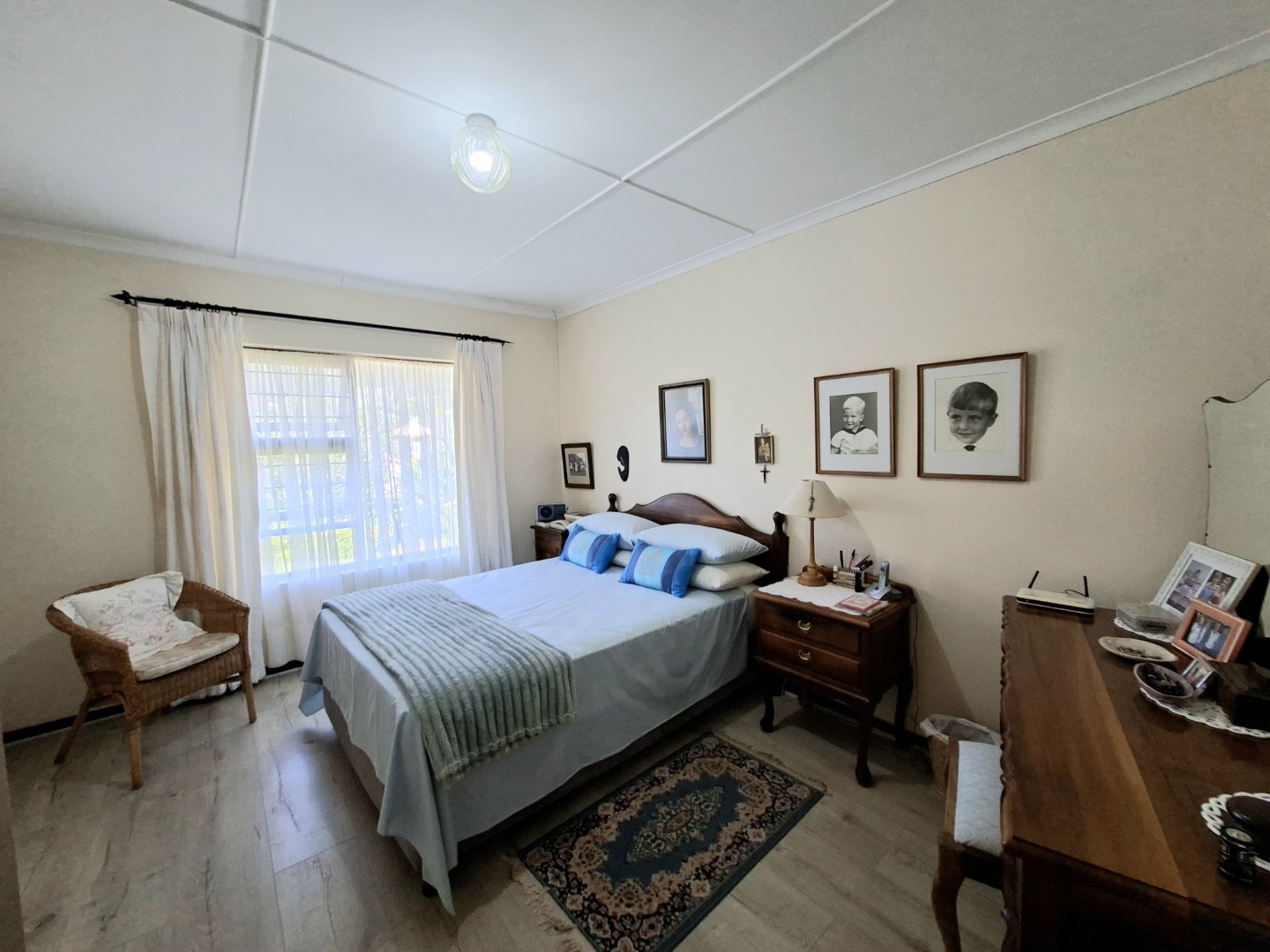 Outdoor living is a highlight, with a charming covered patio, leading to a well-kept grassy garden with established trees and paving. This area is perfect for alfresco dining and entertaining, offering a private oasis. The property benefits from perimeter security, including a fence and an access gate, providing peace of mind. A borehole is also present, offering a sustainable water solution.