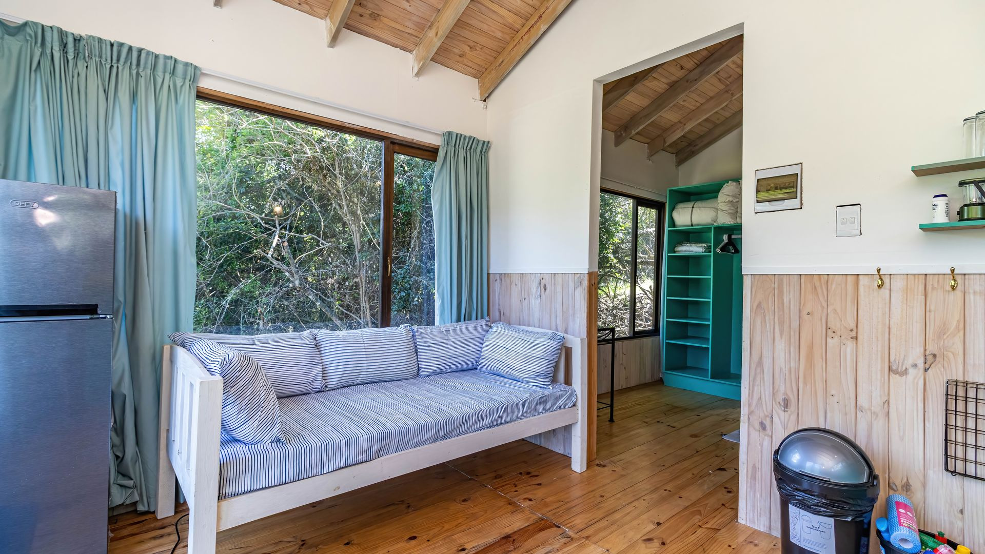 6. River Cottage A – 1 bedroom, 1 bathroom, open-plan kitchen & living, sliding doors to river-view verandah, solar/inverter power, gas geyser & cooker.