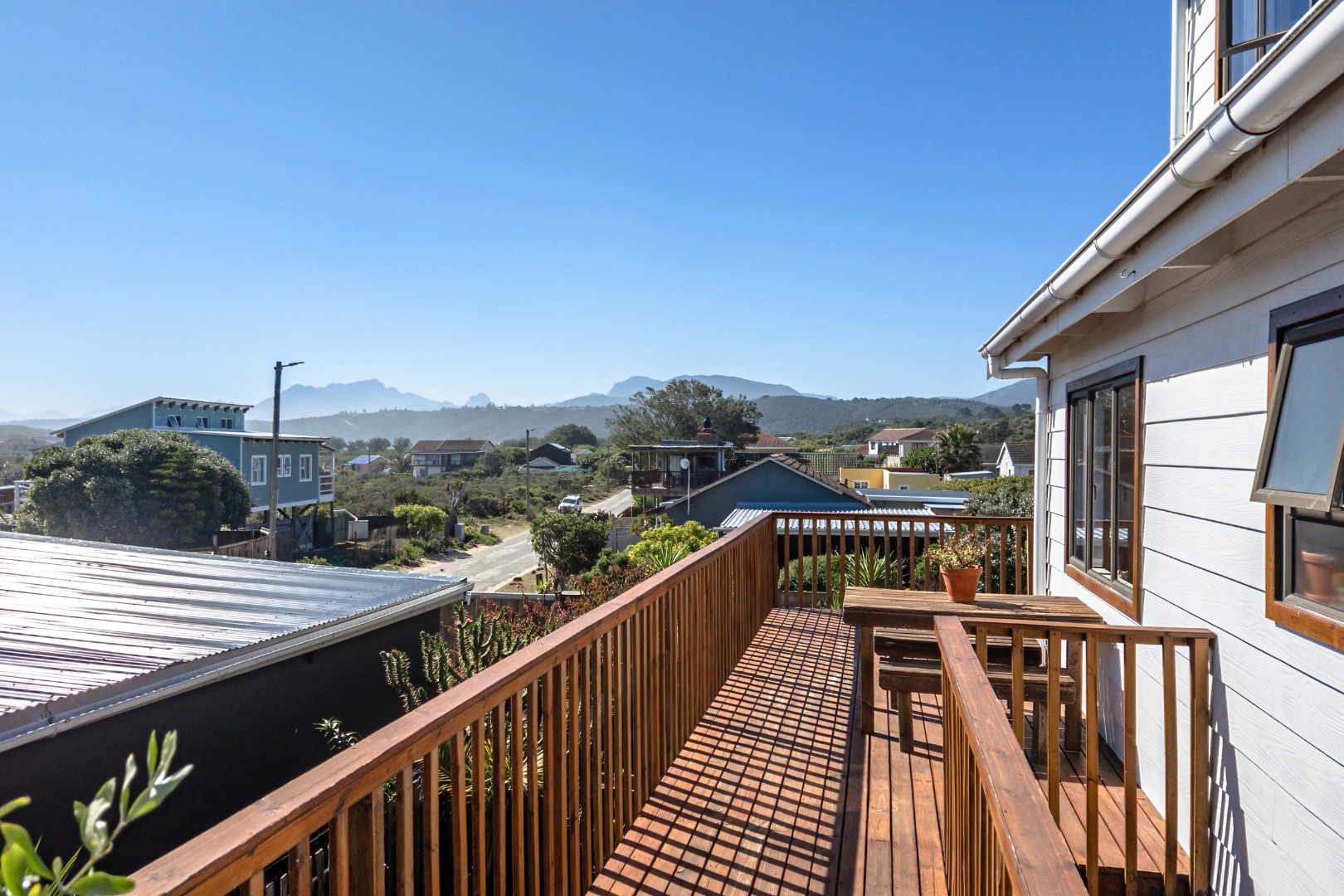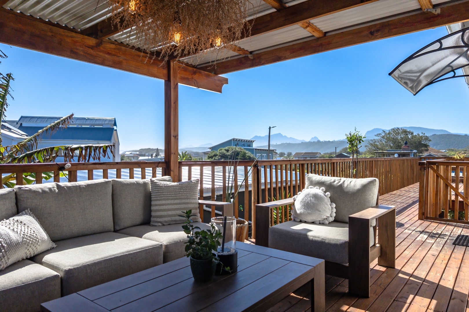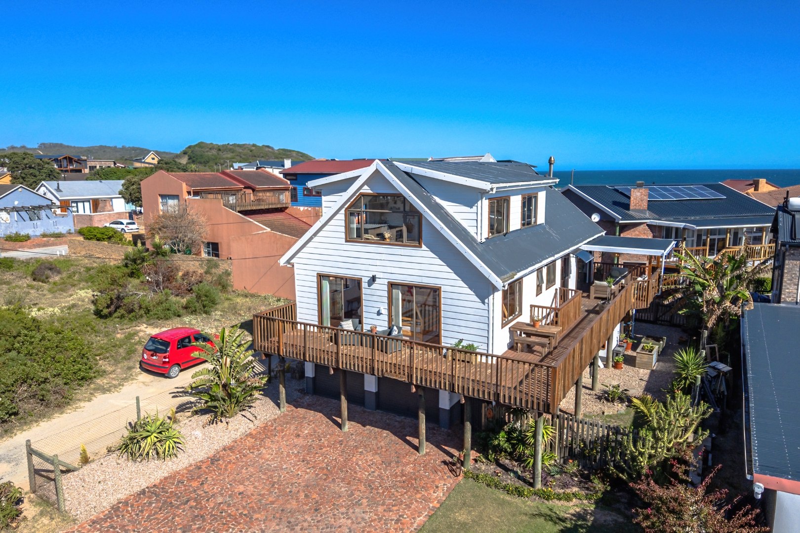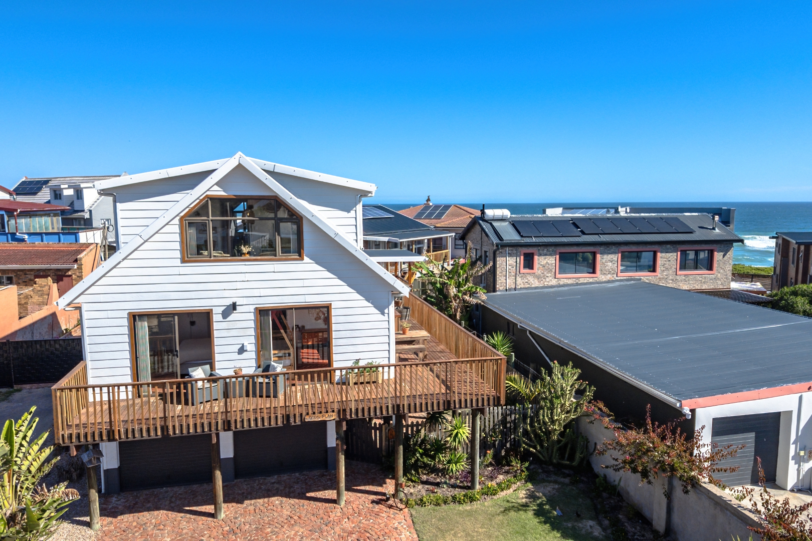 Discover this charming 4-bedroom, 2 bathroom home nestled in the picturesque coastal town of Kleinkrantz, Wilderness. Boasting a modern white exterior with a grey roof, this elevated home offers stunning sea views and a welcoming kerb appeal. The property features an expansive wooden deck, perfect for outdoor living and entertaining, complemented by a paved driveway and two garages.