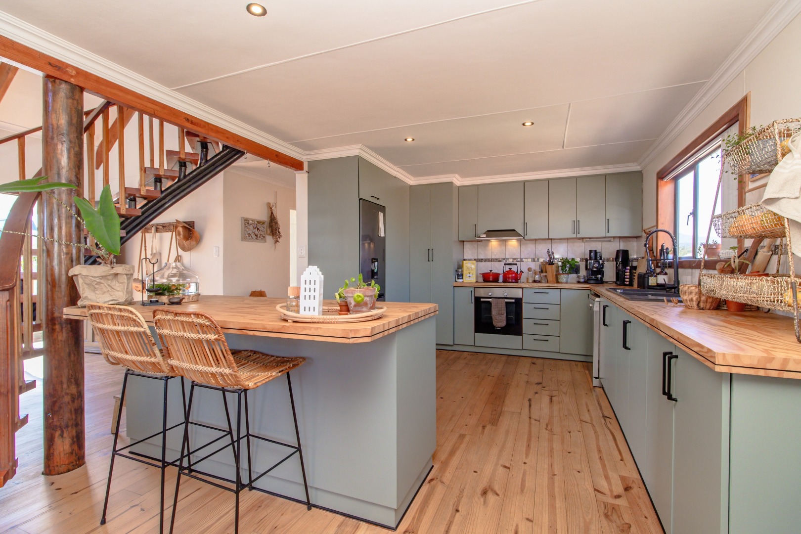 Step inside to an inviting open-plan layout characterized by high vaulted ceilings, warm timber flooring, and abundant natural light from large windows. The heart of the home is a stylish kitchen, equipped with modern sage green cabinetry, natural wood countertops, and contemporary black fixtures. Two comfortable lounges provide ample space for relaxation, while a charming wood-burning stove adds a cozy ambiance.