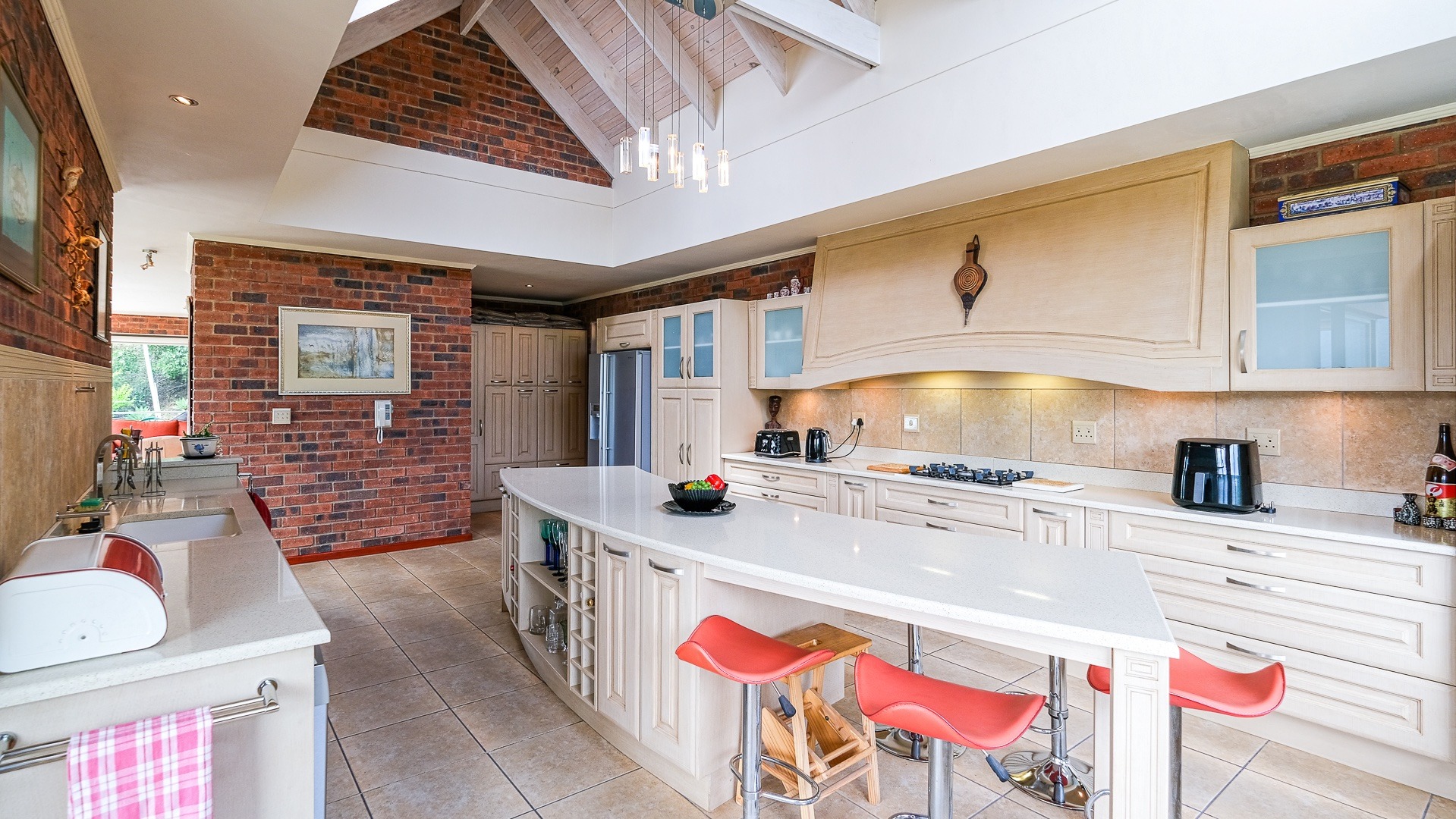 Adjacent to the lounge, TV and dining areas is the large kitchen, equipped with high-end appliances, custom cabinetry, and ample countertop space for meal preparation. The kitchen features an island, creating a central gathering point for casual dining and socializing. A scullery and laundry room offer additional storage and workspace.