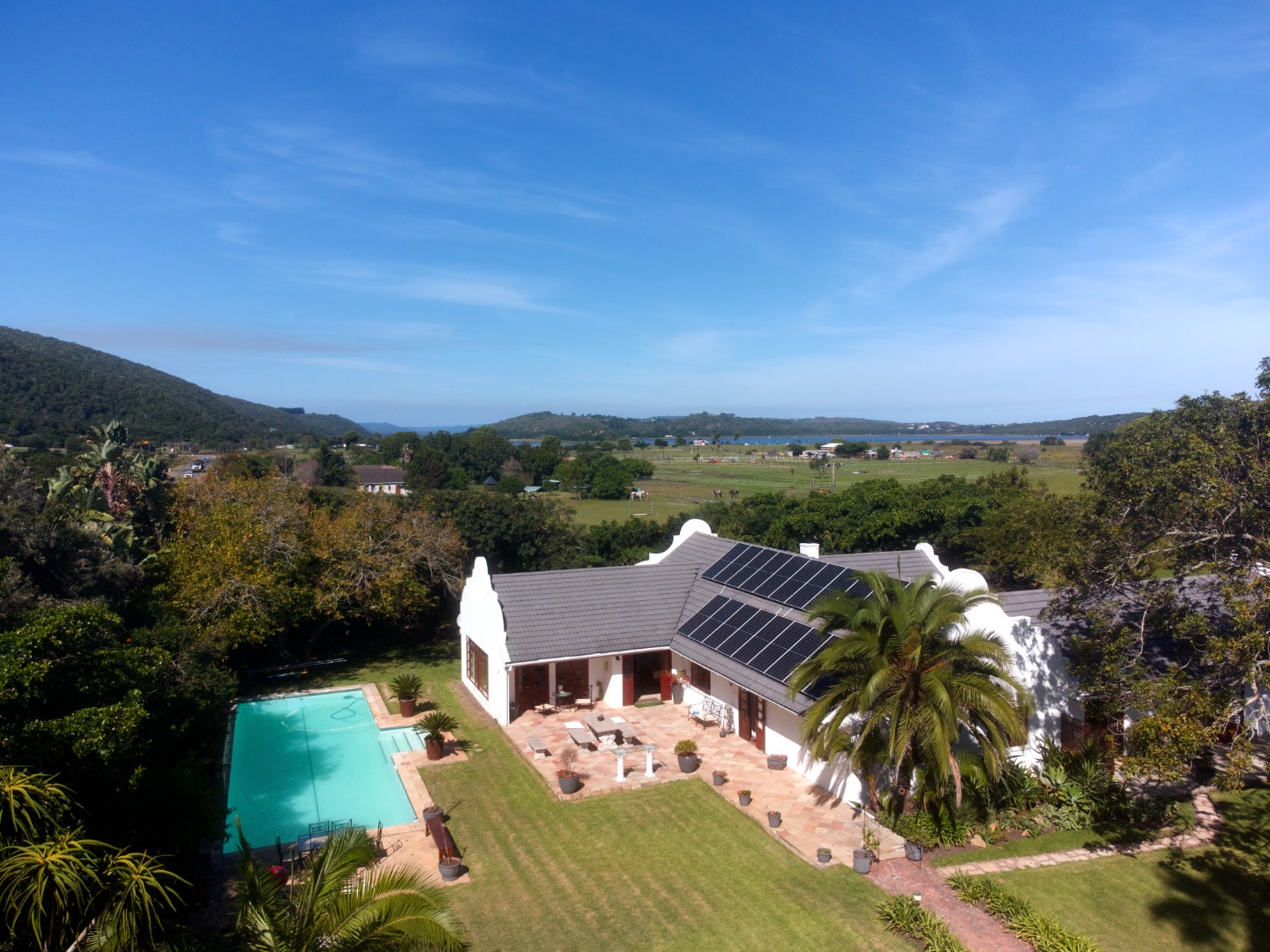 As you enter the landscaped garden, you'll be greeted by a magnificent manor house, complete with a sprawling swimming pool, two charming flats, and a traditional rondawel.