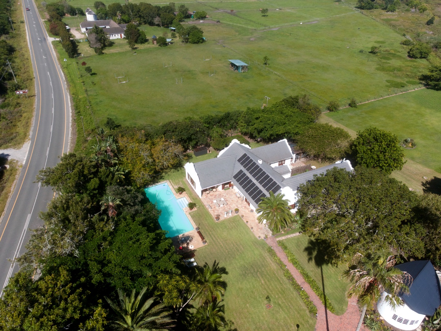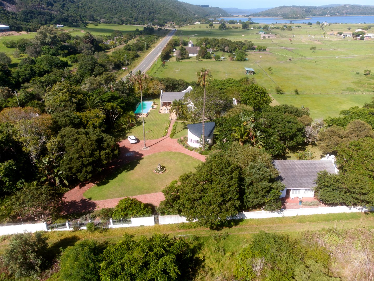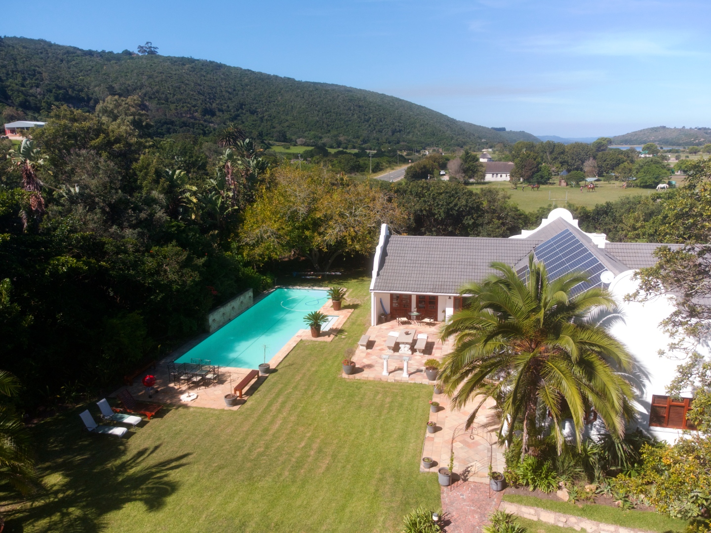 As you enter the landscaped garden, you'll be greeted by a magnificent manor house, complete with a sprawling swimming pool, two charming flats, and a traditional rondawel.