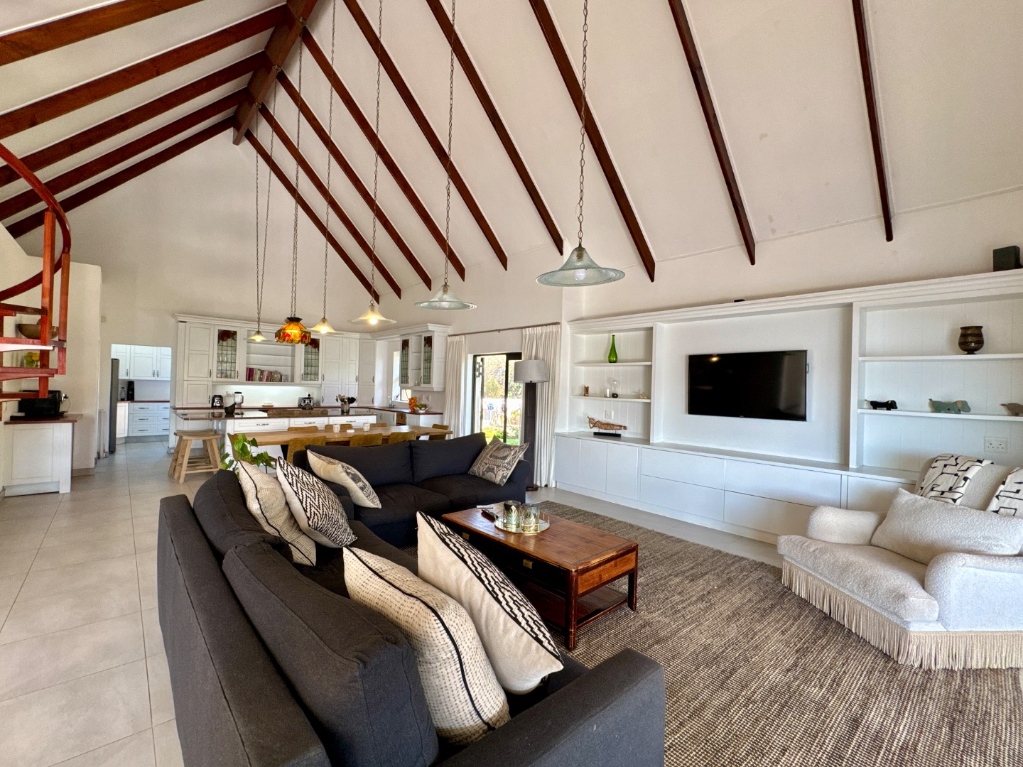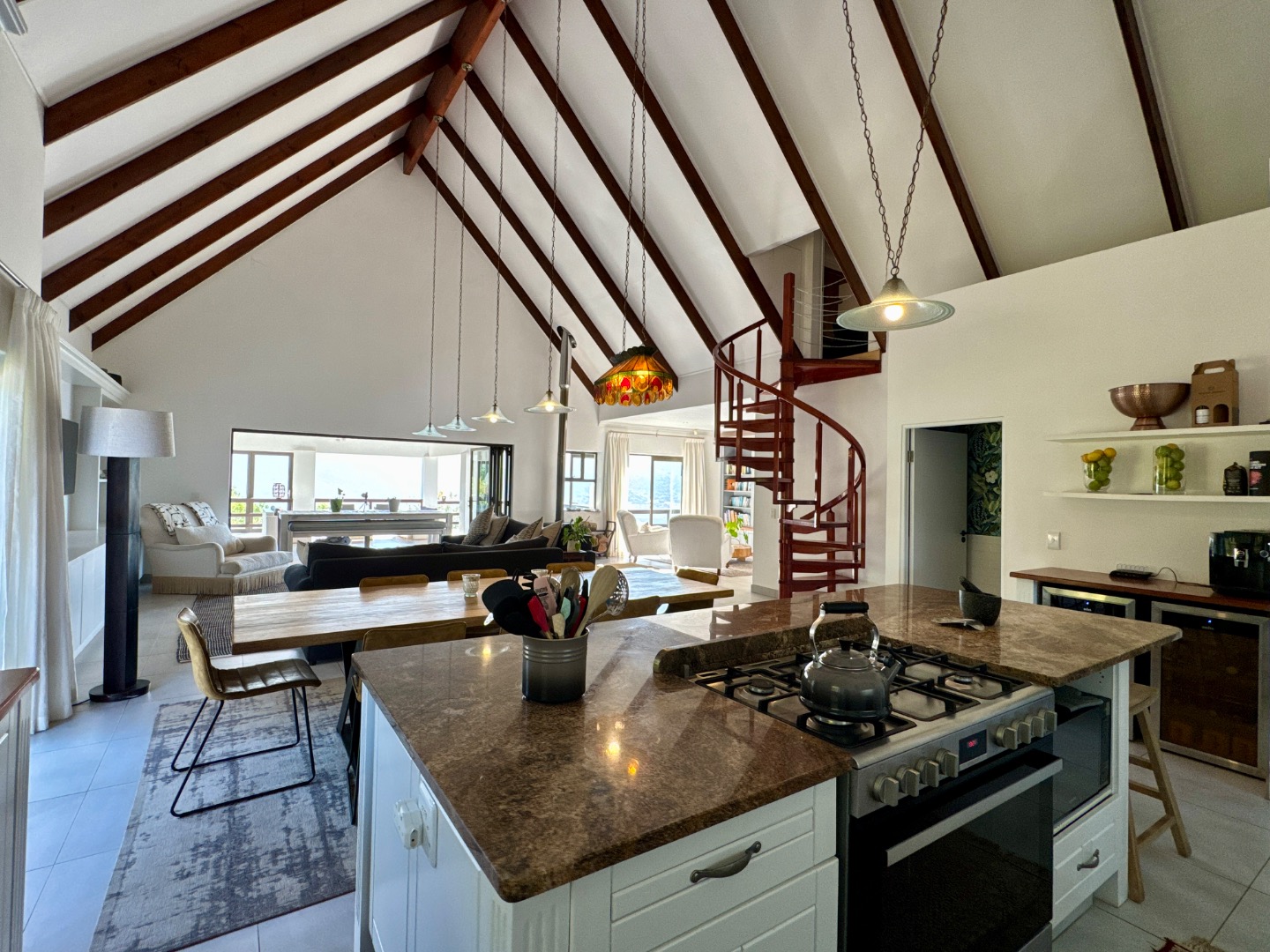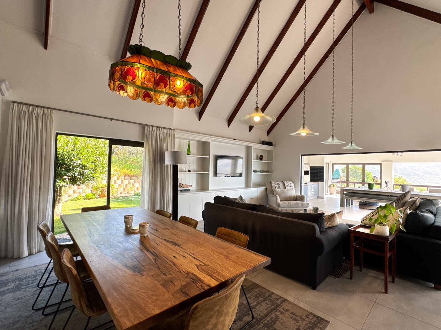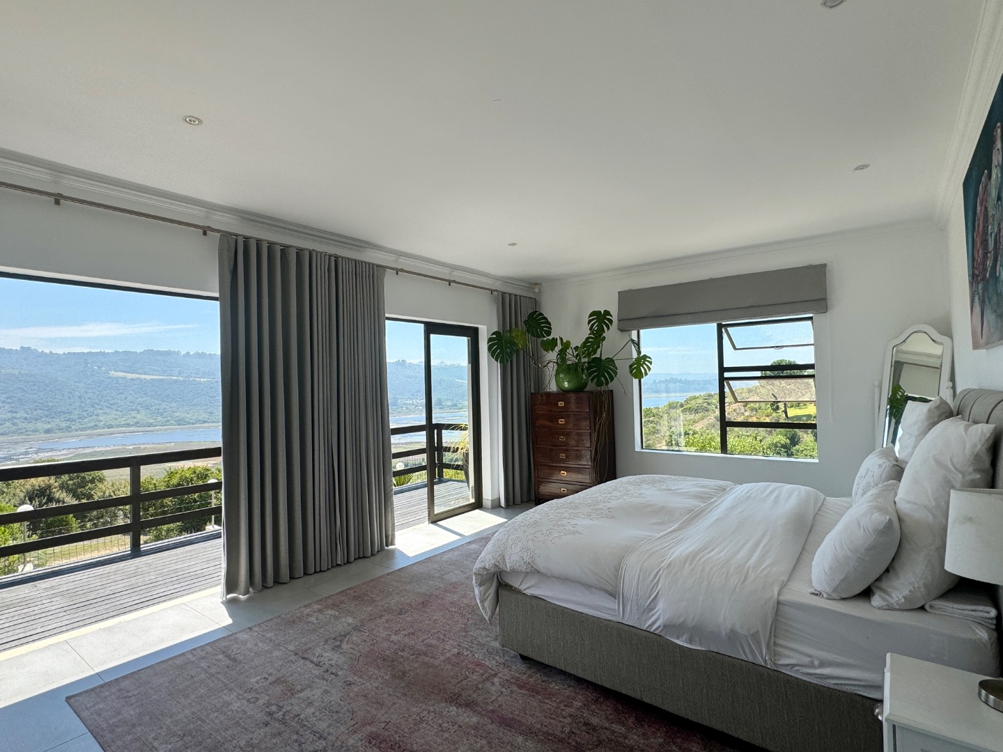Nestled in the tranquil surrounds of Wilderness National Park, this modern home offers breathtaking views of Bo-Langvlei Lake from its elevated position on 1.5 hectares of lush land. Designed to capture the beauty of its natural setting, the north-facing residence features spacious, light-filled living areas with soaring vaulted ceilings, creating an airy and welcoming atmosphere.