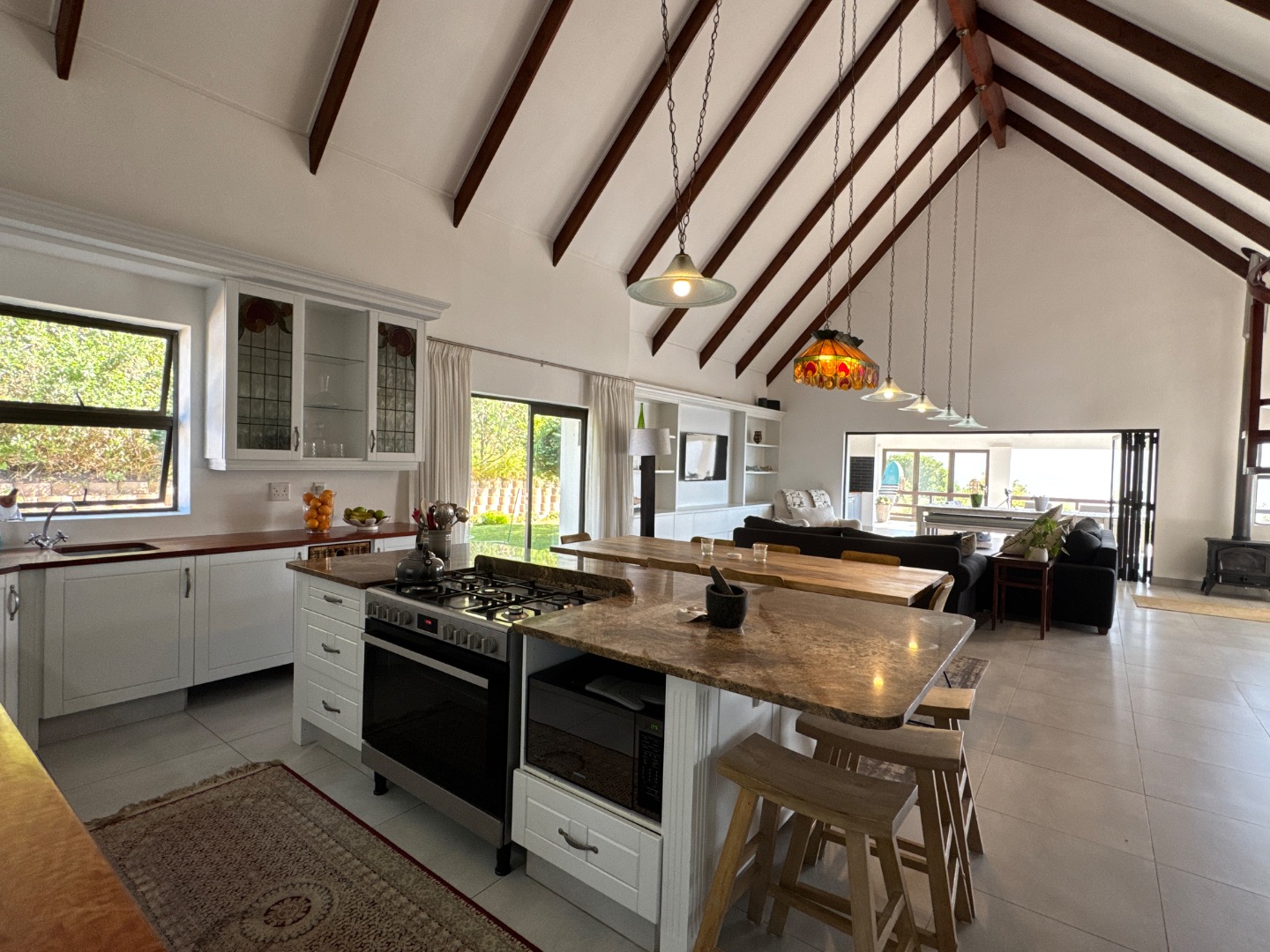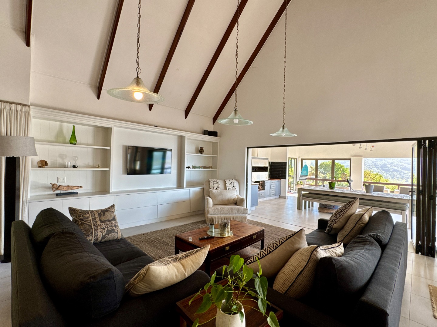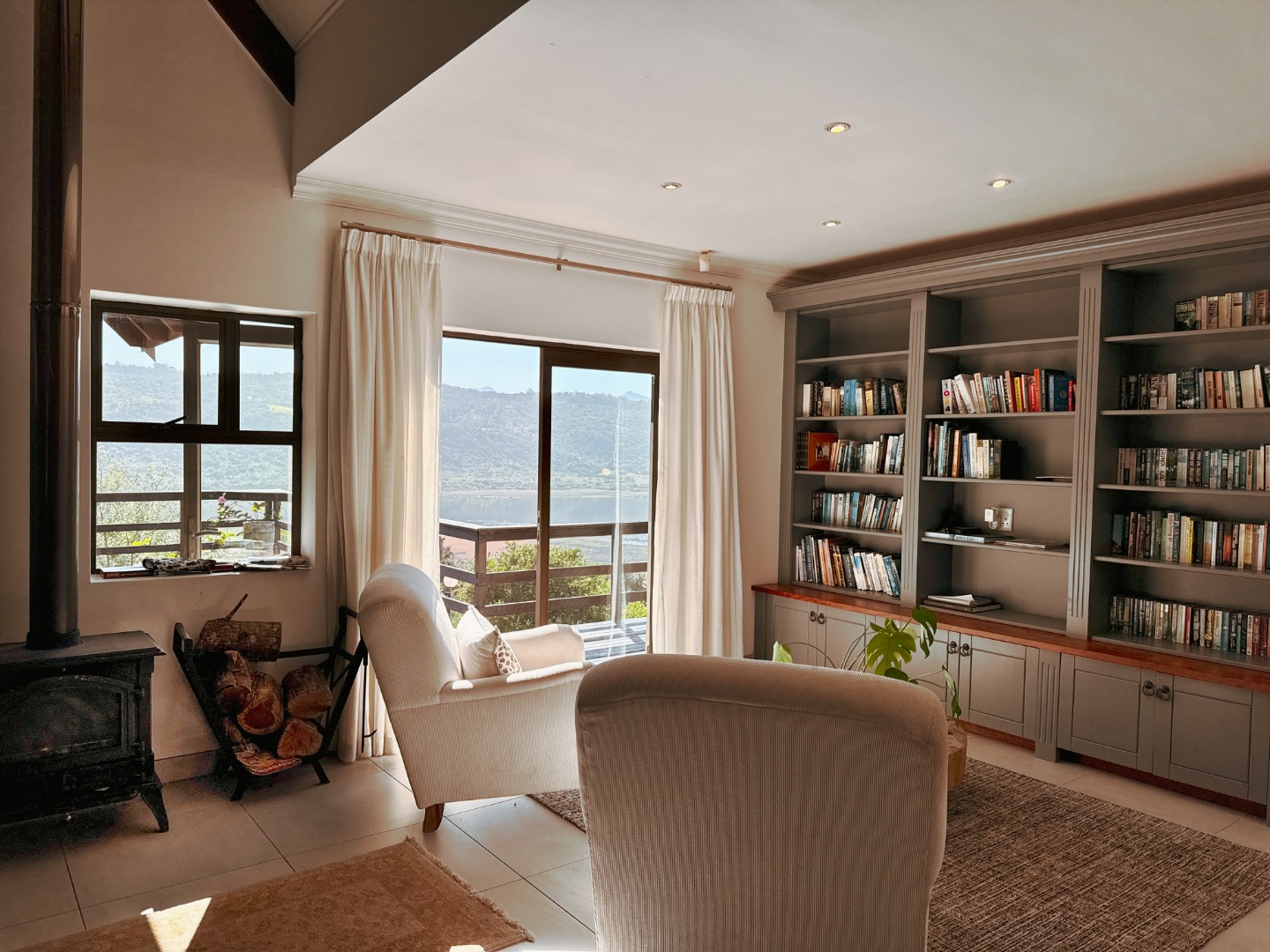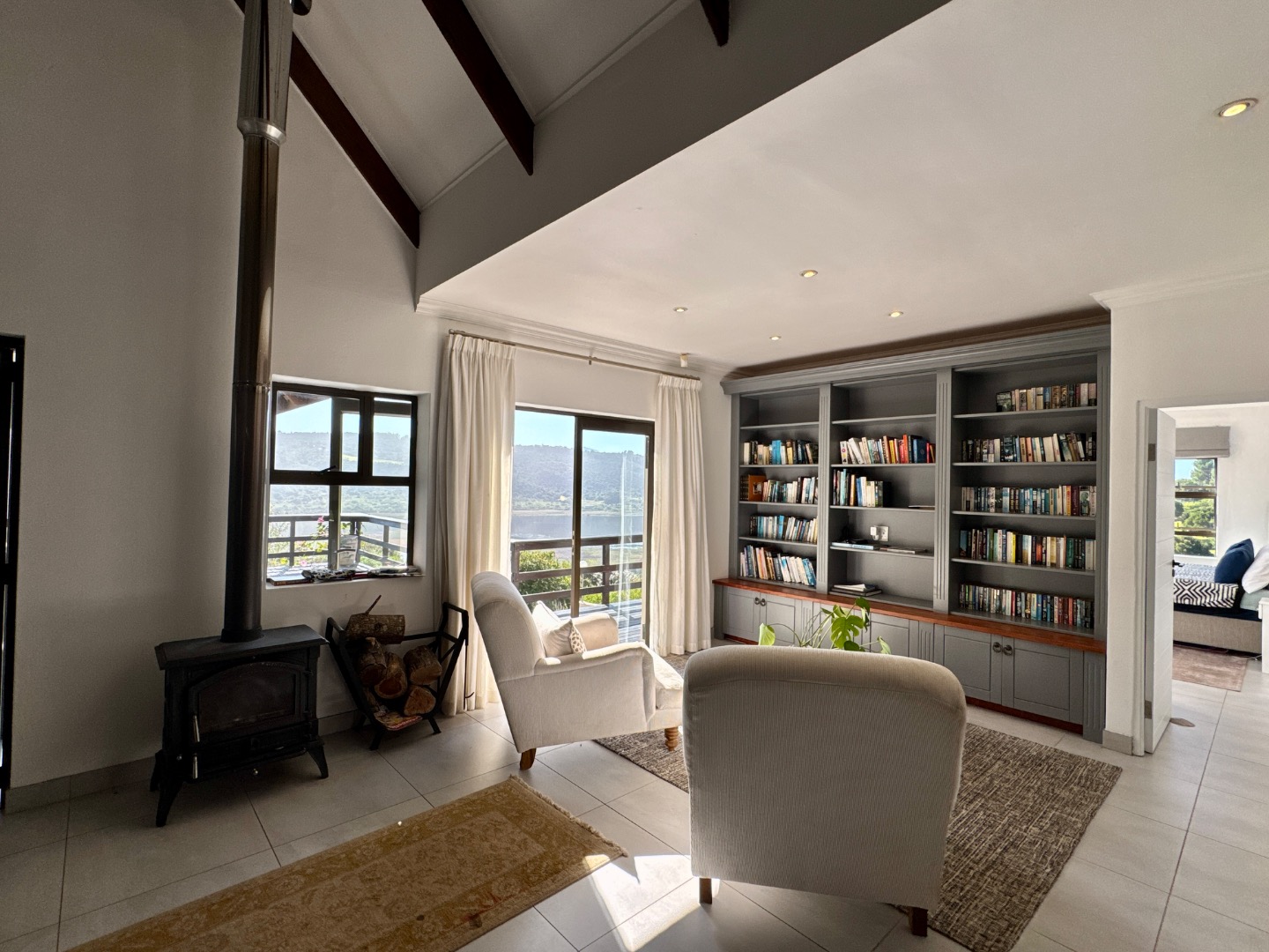 The open-plan lounge, complete with a cozy closed-combustion fireplace, seamlessly connects to a TV lounge and dining area, all opening onto a covered patio with built-in braai, perfect for entertaining while soaking in stunning lake vistas.