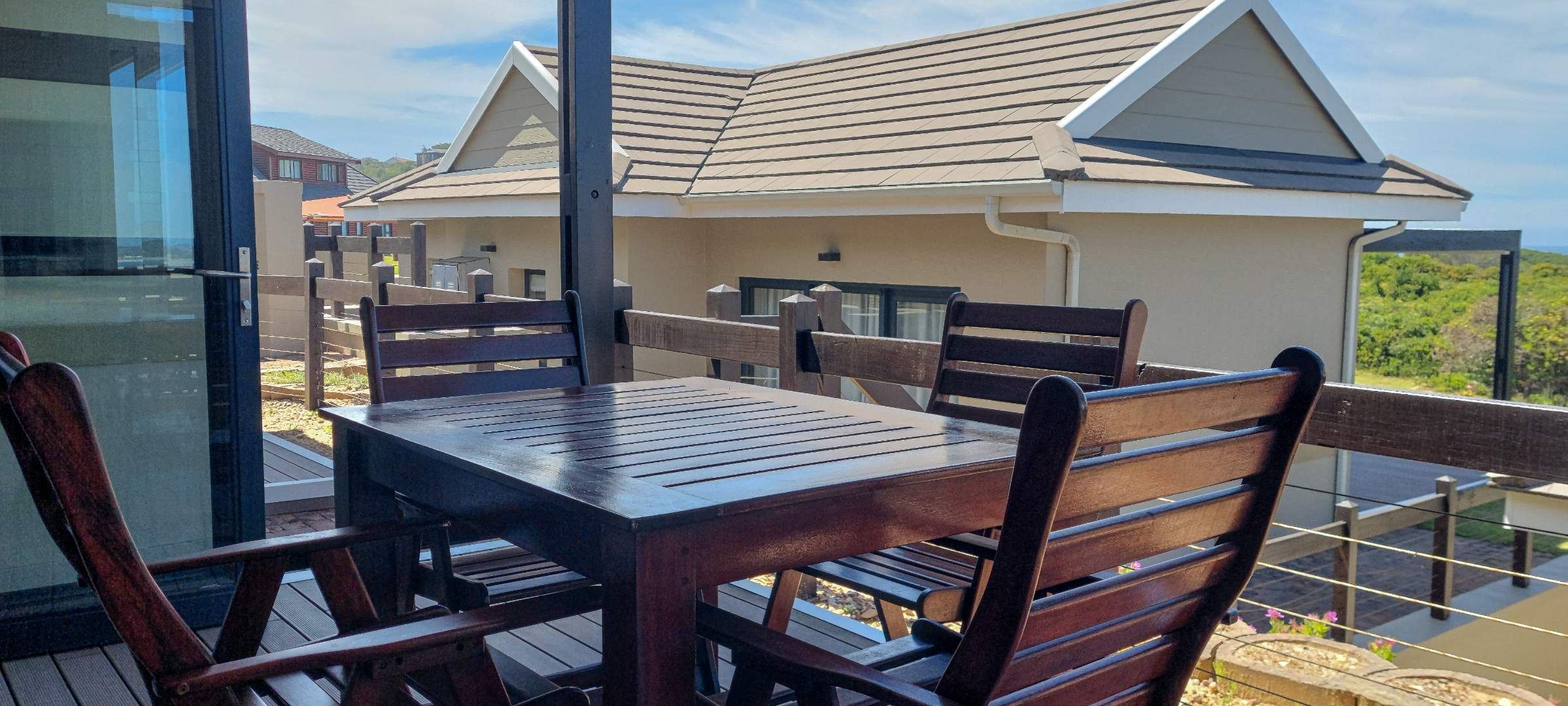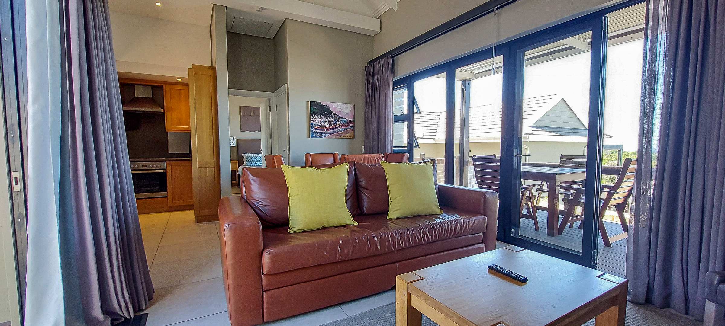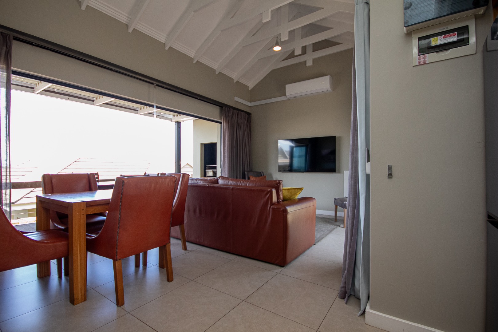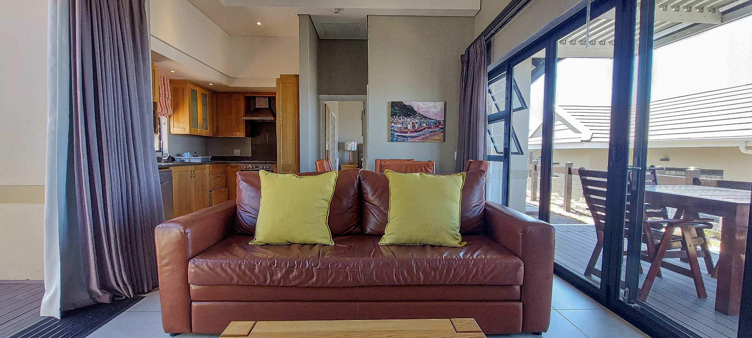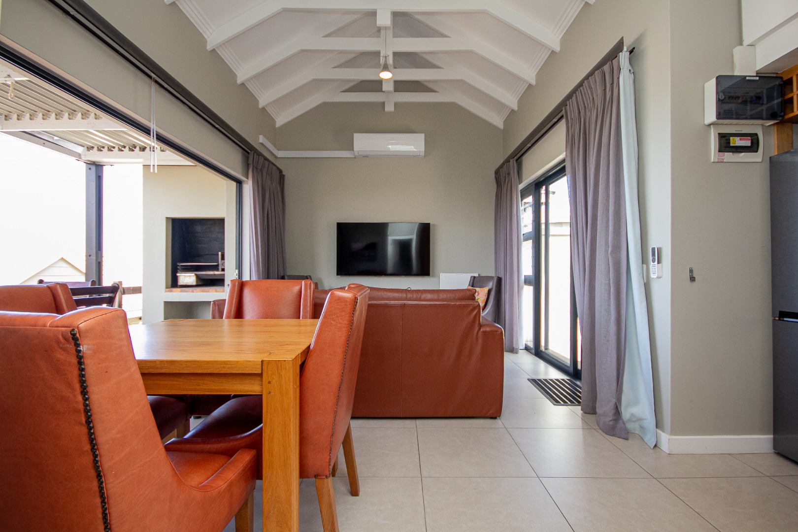 This inviting 1 bedroom, 1 bathroom rental in Brenton On Sea offers relaxed coastal living with a generous 168 sqm floor size. The open plan layout connects the lounge, dining area, and kitchen, with large glass doors that fill the space with natural light and open to the outdoor area. The modern kitchen includes stainless steel appliances, light wood cabinetry, and dark countertops.