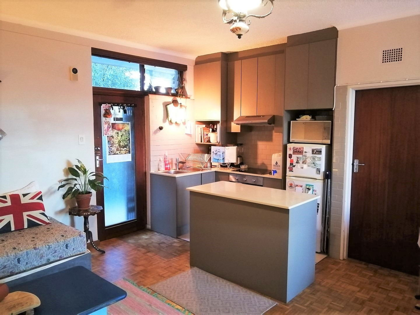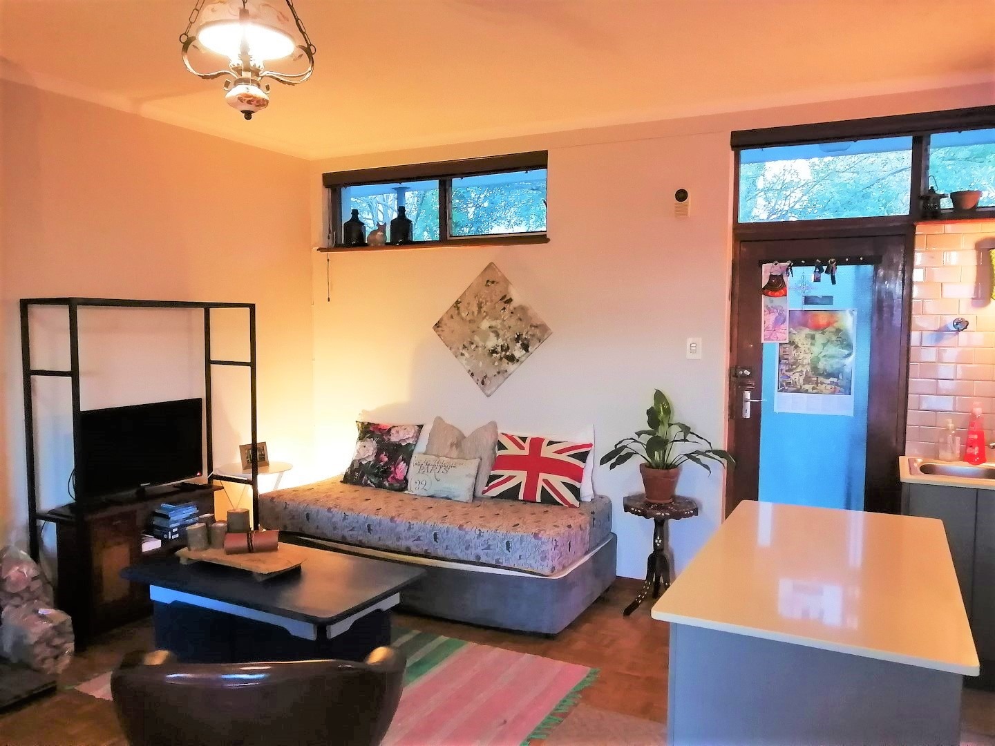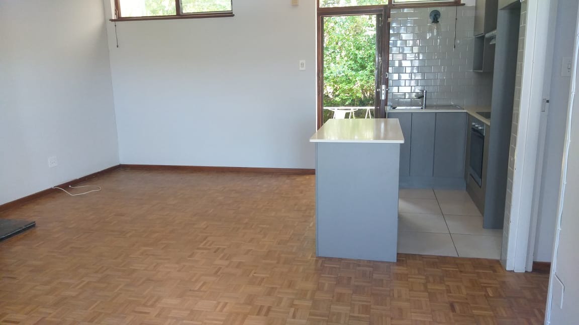 Discover this inviting 1-bedroom, 1-bathroom apartment spanning 65 sqm in Knysna Central. The open-plan living area features a small, modern kitchen with sleek grey cabinetry, a subway tile backsplash, built-in hob, oven, and a breakfast bar. Parquet flooring, freshly painted walls, and a stone-clad fireplace enhance the ambiance. The well-appointed bedroom offers a private retreat. This complex does not offer separate flat patios, but rather, a communical garden and wash line.