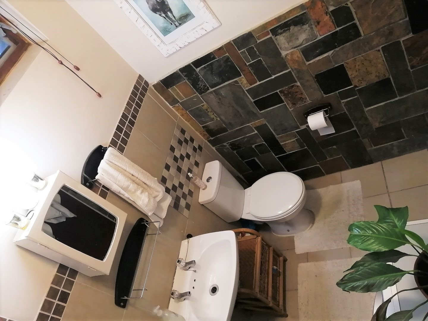 Natural light fills the space, with balcony access providing scenic water and distant mountain views. The bathroom boasts a distinctive natural slate accent wall. Ideal for a lock-up-and-go lifestyle, security is ensured by a secure gated entrance, burglar bars, and a security gate.