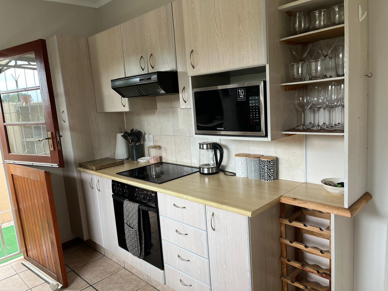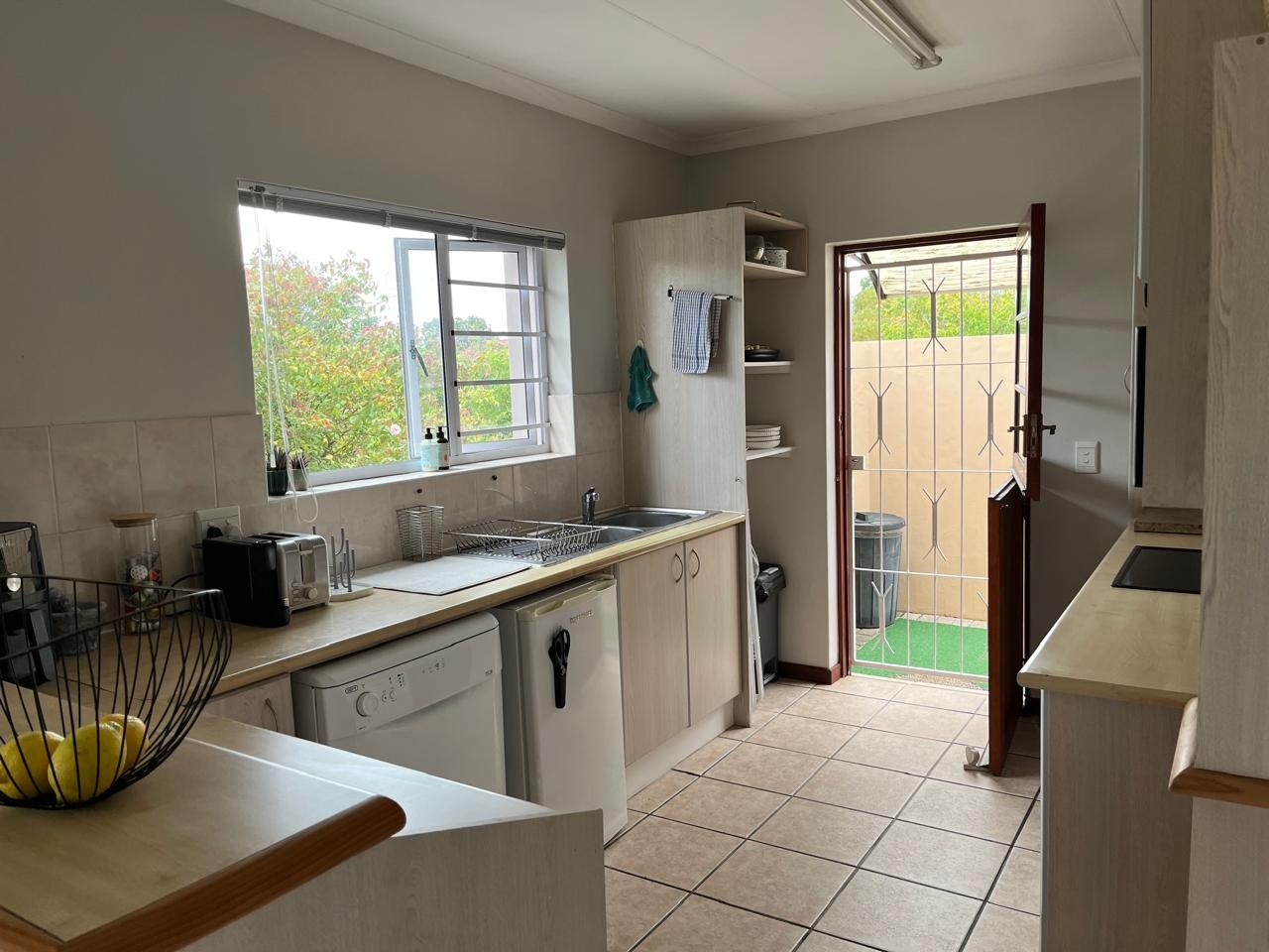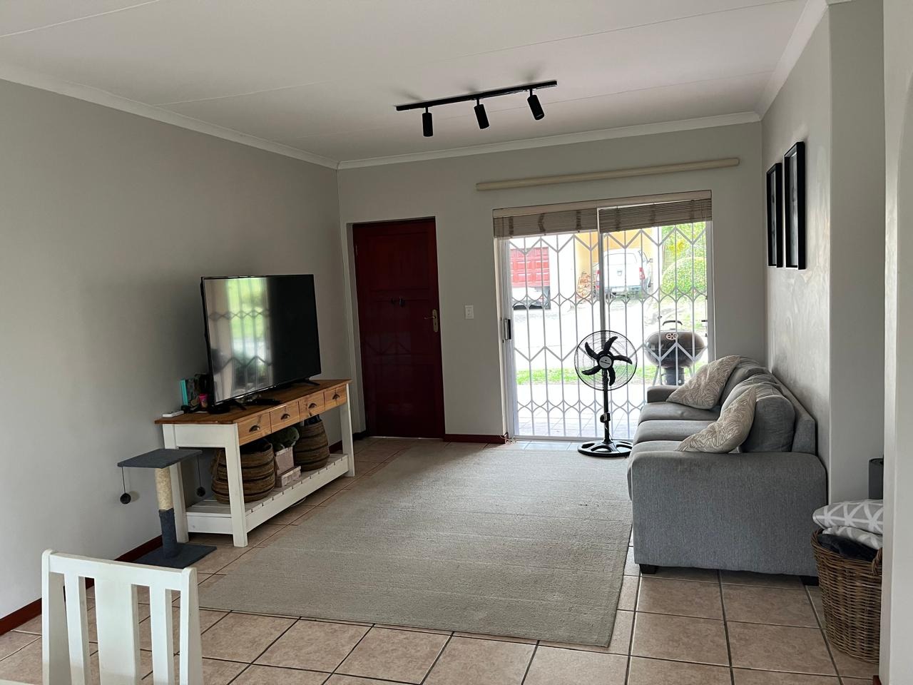 This inviting 2-bedroom, 1-bathroom rental property is situated within a secure, gated community in Old Place, Knysna. Designed for comfortable living, the residence features an open-plan lounge and dining area, creating a bright and versatile space for relaxation and entertaining. Neutral walls and tiled flooring extend throughout, offering a clean and adaptable aesthetic. The kitchen is equipped with light-colored cabinetry, benefiting from a large window that provides natural light and a pleasant view of greenery. A sliding door from the living area leads to a patio, enhancing indoor-outdoor flow.