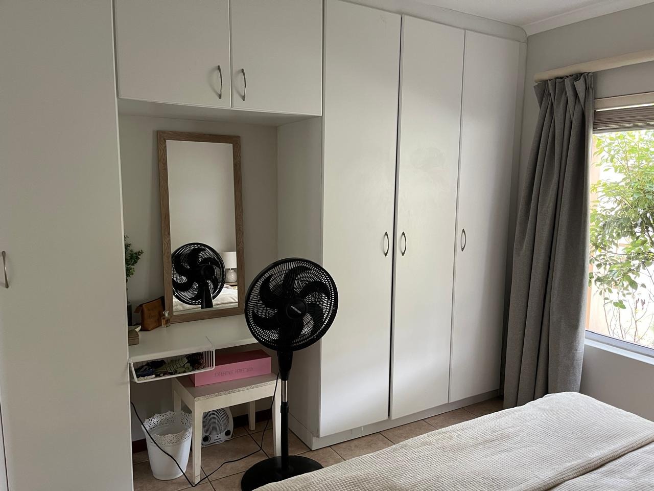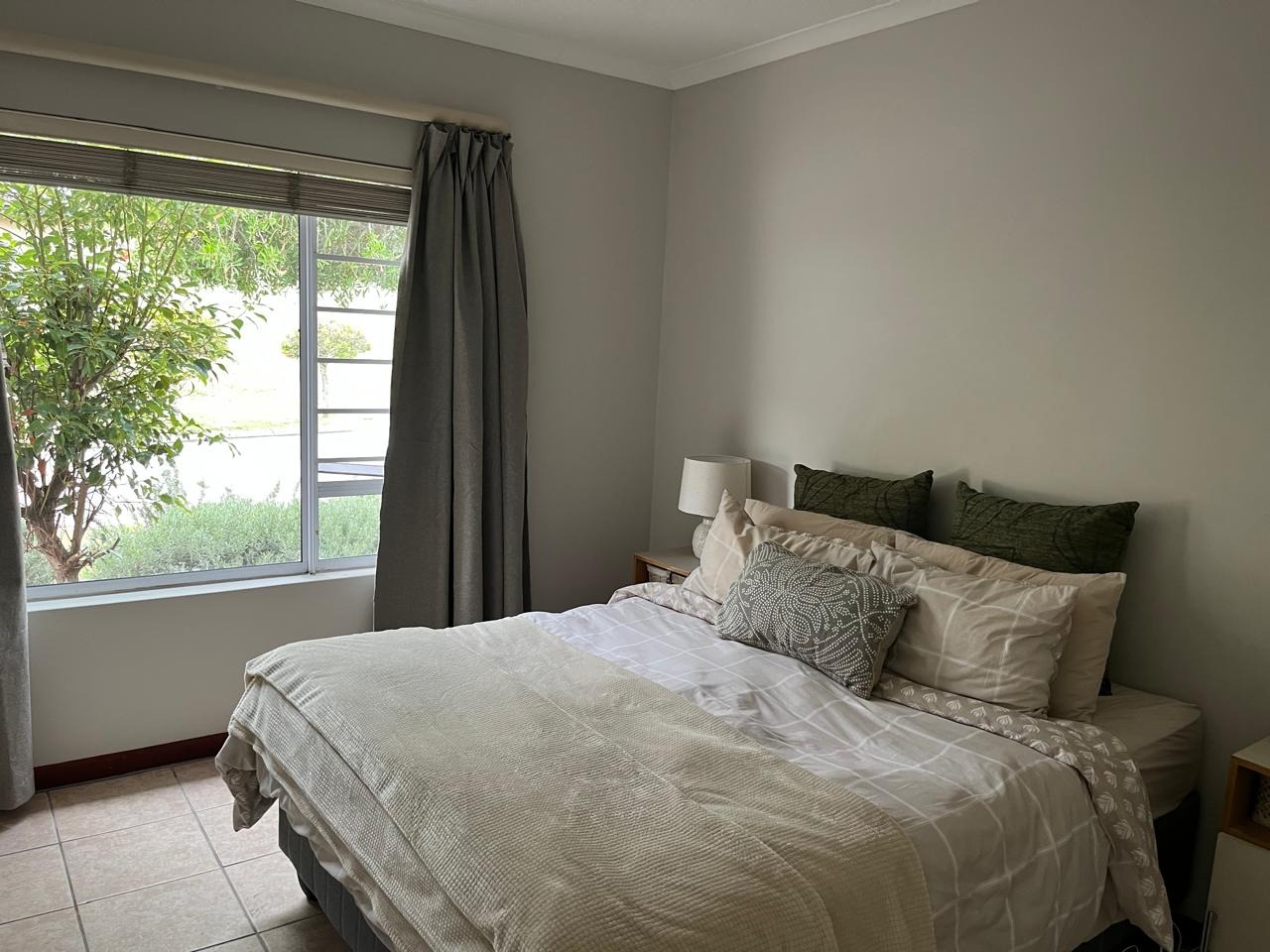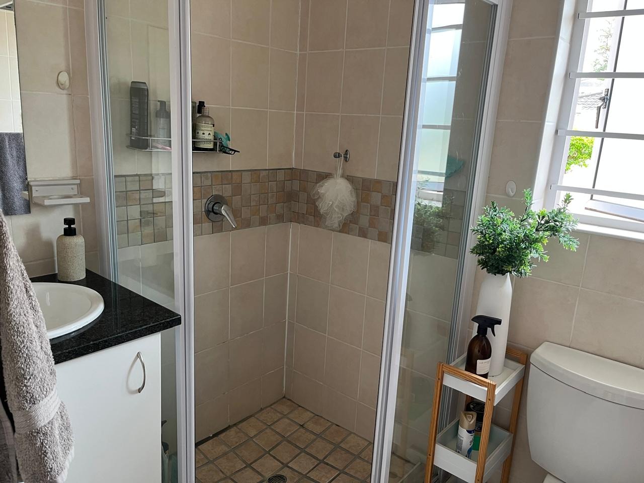The two bedrooms are well-proportioned, each featuring large windows that invite ample natural light and offer views of the surroundings. Both rooms maintain the neutral decor and tiled flooring. The single bathroom is functional, featuring a modern tiled shower with a glass enclosure and a vanity with storage.