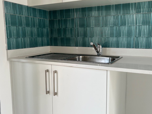 The home offers a comfortable layout with a dedicated lounge, a dining room, and a functional kitchen equipped with modern white cabinetry, a light countertop, and a striking teal/aqua vertical tile backsplash. One of the two bathrooms is an ensuite, providing added convenience and privacy. The property is designed for a relaxed lifestyle, with a patio perfect for outdoor enjoyment and an established garden featuring mature trees that offer natural shade and a serene environment. Pets are allowed, making it an ideal choice for families or individuals with furry companions.