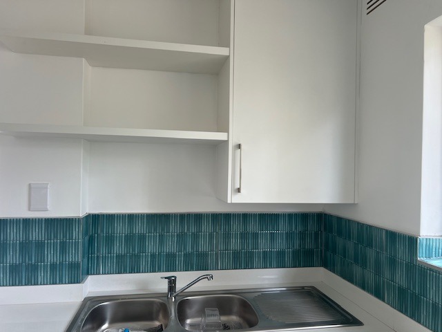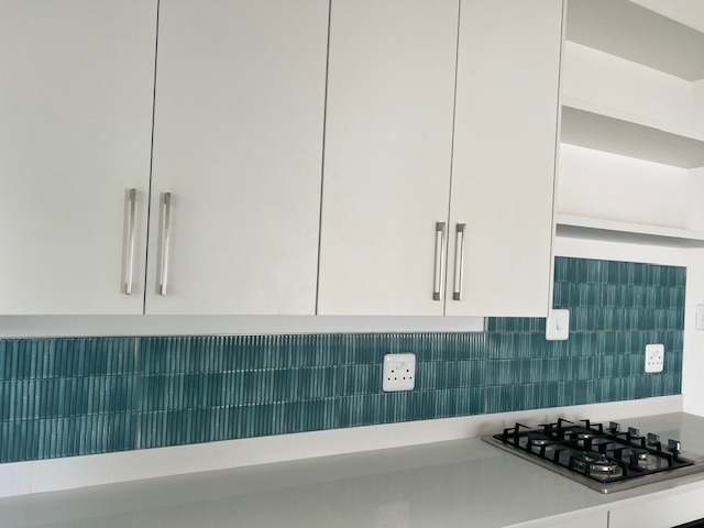 The home offers a comfortable layout with a dedicated lounge, a dining room, and a functional kitchen equipped with modern white cabinetry, a light countertop, and a striking teal/aqua vertical tile backsplash. One of the two bathrooms is an ensuite, providing added convenience and privacy. The property is designed for a relaxed lifestyle, with a patio perfect for outdoor enjoyment and an established garden featuring mature trees that offer natural shade and a serene environment. Pets are allowed, making it an ideal choice for families or individuals with furry companions.