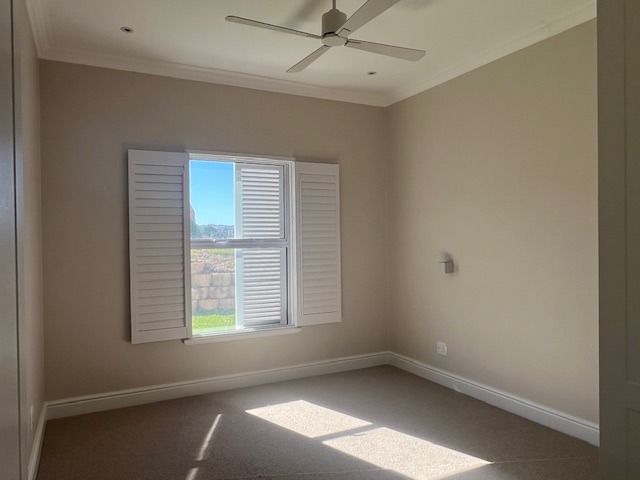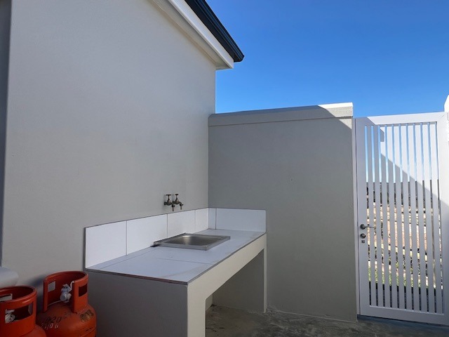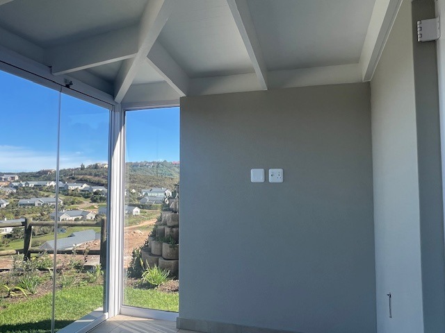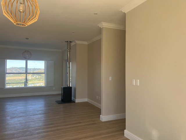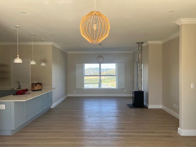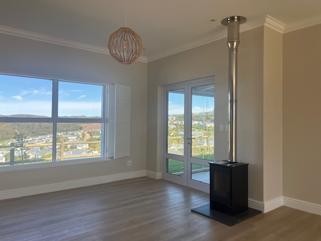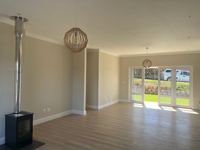 Discover modern living in this inviting 3-bedroom, 2-bathroom residence available for rent within a secure estate in Welbedacht, Knysna. This contemporary home features an open-plan layout, seamlessly connecting the lounge, dining area, and a stylish kitchen equipped with a central island and ample cabinetry. Enjoy the warmth and ambiance provided by a modern wood-burning stove, complemented by elegant wood-look flooring and crown molding throughout the living spaces.